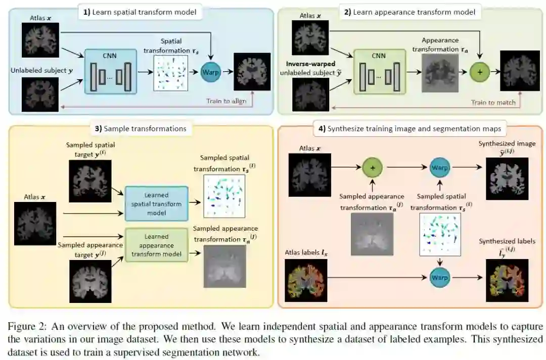 摘要:图像分割是医学应用中的一个重要课题。基于卷积神经网络的方法获得了最先进的精度;然而,它们通常依赖于带有大型标记数据集的监督训练。医学图像的标注需要大量的专业知识和时间,而典型的手工调优的数据增强方法无法捕捉这些图像中的复杂变化。我们提出了一种自动数据增强方法来合成标记医学图像。我们在分割磁共振成像(MRI)脑扫描的任务中展示了我们的方法。我们的方法只需要一次分段扫描,并利用半监督方法中的其他未标记扫描。我们从图像中学习转换模型,并使用该模型和带标记的示例来合成其他带标记的示例。每个转换都由空间变形场和强度变化组成,从而能够综合复杂的效果,如解剖学和图像采集过程的变化。我们展示了使用这些新示例训练有监督的分割器,对于one-shot生物医学图像分割的最先进方法有着显着的改进。我们的代码可以在https://github.com/xamyzhao/brainstorm上找到。