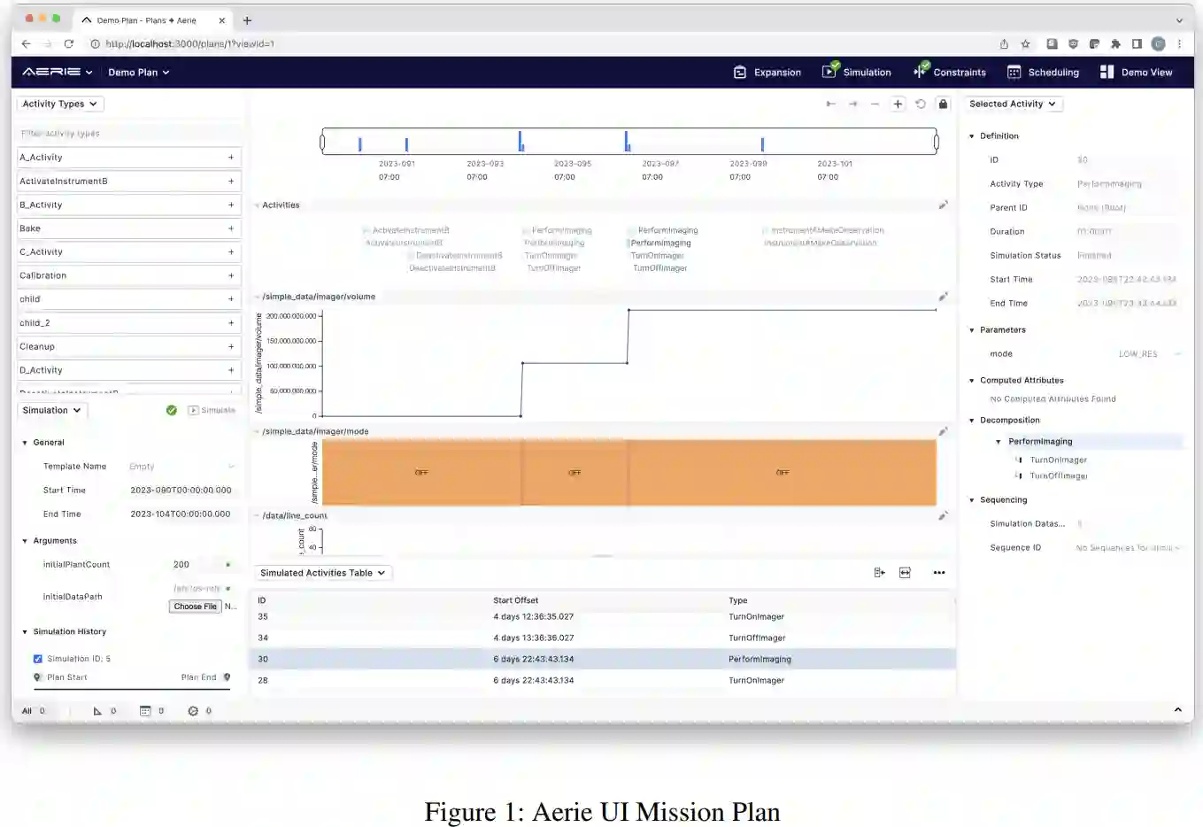 除了对 Aerie 的开发有直接影响的系统外,还有许多与 Aerie 类似的用于多任务的规划系统。例如,应用物理实验室(APL)开发的 "Activity Planner "工具是其独立任务地面软件(MIGS)工作的一部分(Ruffolo、McCauley 和 Berman,2017 年)。与 Aerie 一样,该系统也是数据库驱动型的,可以集中并查看来自各种外部来源的计划数据。Activity Planner 选择提供特定领域文件格式的本地导入/导出,而 Aerie 则有意将特定领域的构造排除在其核心之外,以便于其他应用的改编(文件格式之间的转换以针对 API 编写的实用程序的形式存在)。此外,Activity Planner 提供了有限但易于使用的调度和约束检查功能,而 Aerie 则提供了更多的表现力,但可能会牺牲简洁性。