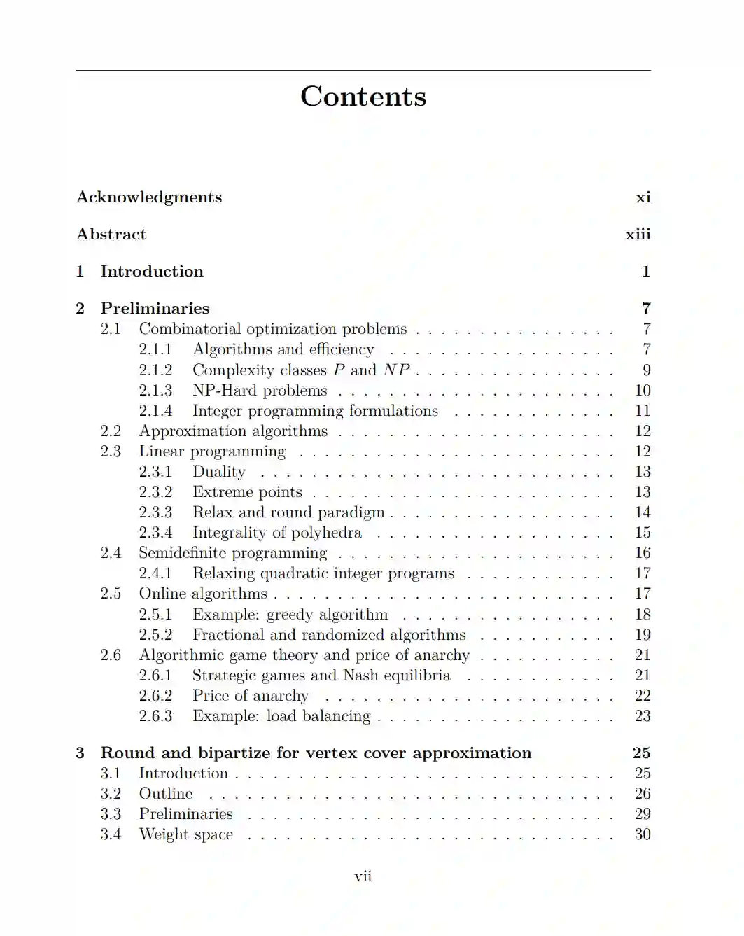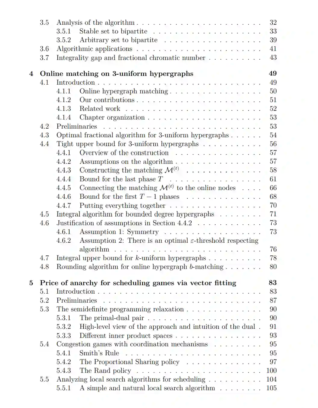 首先,我们对经典的**顶点覆盖问题(Vertex cover problem)及其标准 LP 松弛开展了超越最坏情况的分析(Beyond the worst-case analysis)。该问题在二分图上可高效求解,而在一般图上通过对 LP 解进行取整可获得 2-近似算法。我们引入了新参数并设计了一种算法,其达到的界限能够在上述两个极端情况之间进行插值。对于三着色图,我们的结果揭示了 LP 的整数值间隙(Integrality gap)何时因图结构的影响而减小至 1。 其次,我们研究了经典在线二分匹配问题在超图上的扩展,特别关注在线顶点到达模式下的 3-均匀超图。我们为该问题提出了一个最优的原始-对偶(Primal-dual)分数算法,并构造了一个对抗实例以确立匹配的上界。此外,针对在线节点度数有界的情形,我们提供了一个优于贪心策略的随机化整数算法。 随后,我们考虑了以最小化加权完成时间之和为目标的若干调度与拥塞问题。我们在单一半正定规划上引入了一个对偶拟合(Dual fitting)框架,该框架能够同时为局部搜索算法的近似比、在线算法的竞争比以及博弈的无序代价提供紧确界的简洁证明。通过这一统一框架,我们的研究简化并统一了该领域的重要既有成果。 最后,我们研究了二叉堆上的在线图搜索问题,该问题与求解整数规划的分枝定界算法(Branch and bound algorithm)**密切相关。我们提供了一种新的随机化算法,虽然略微增加了空间开销,但提升了该问题的已知最佳运行时间。
