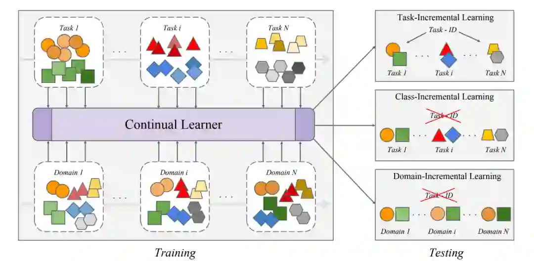 近年来,基础语言模型(LMs)在自然语言处理(NLP)[136, 226, 232]和计算机视觉(CV)[188]领域设立了新的基准。基础语言模型主要包括三大类:预训练语言模型(PLMs)[136]、大语言模型(LLMs)[226]和视觉-语言模型(VLMs)[42]。PLMs如BERT [88]、RoBERTa [120]和BART [102]专注于文本任务,通过利用掩码语言建模等任务进行预训练,对于理解和生成语言至关重要。LLMs如GPT-4 [1]和LLaMA [173]通过扩大模型架构和训练数据的规模,扩展了PLMs的能力,从而增强了它们在更广泛任务中的普适性和适应性。VLMs如VisualBERT [106]、CLIP [154]、LLaVA [113]和DALL-E [156]集成了文本和图像模态,使视觉和文本信息之间能够进行复杂交互。这些模型的基本范式是通过在广泛的、通常是无标签的数据集上进行预训练来捕获丰富的语义信息,然后针对具体任务或领域进行微调。这种方法不仅提升了各类应用的性能,还显著增强了模型的灵活性和任务适应性 。 然而,这些基础模型在具有一系列任务的动态环境中往往表现出局限性,主要原因是训练完成后参数固定。这些模型通常缺乏在不进行重新训练的情况下整合新数据或概念的能力。一个重要挑战是“灾难性遗忘”[92],即模型在学习新信息时会丧失先前获得的知识。这与人类的持续学习过程形成鲜明对比,人类学习过程本质上是连续且适应性的。尽管多任务学习(MTL)和迁移学习(TL)在某些应用中取得了成功,但它们在现实场景中有其局限性。MTL需要在开始时就提供所有任务及其数据,这在推出新服务时构成挑战,因为模型必须重新训练所有数据。此外,TL通常只涉及两个任务,即源任务和目标任务,这对于拥有多个目标任务的现实在线平台来说是不切实际的。为了解决这些挑战,模型需要处理和学习不断扩展和多样化的数据集。这需要允许模型在适应新语言现象和趋势的同时,不影响对历史数据的准确性和敏感性的机制。