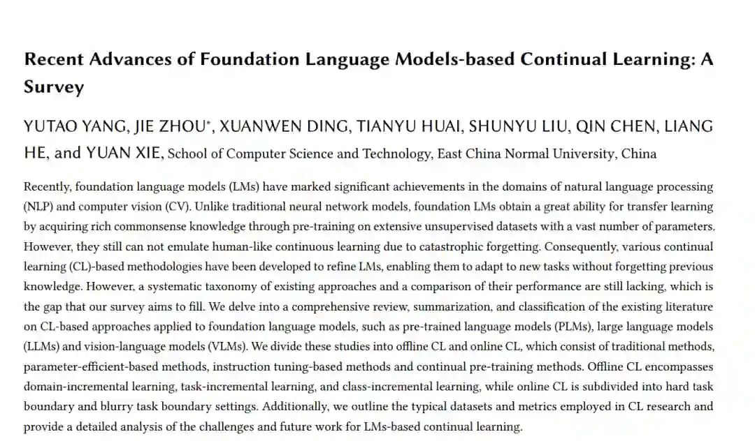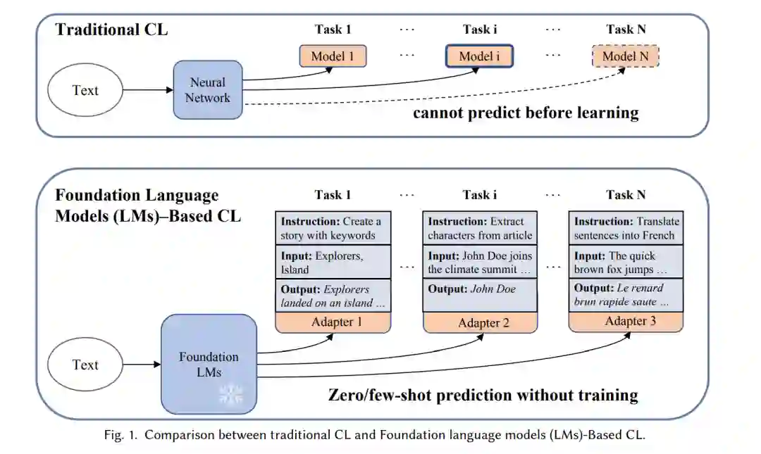 在持续学习领域,传统方法向整合基础语言模型的方法发生了显著的范式转变(见图1)。首先,基础语言模型由于在大规模数据集上的广泛预训练,展示了增强的泛化和迁移学习能力。模型具有快速适应下游任务的专门迁移能力,只需少量样本。因此,在促进新技能获取的同时,减轻零样本迁移和历史任务能力的退化至关重要。其次,由于基础语言模型中大量的参数,采用参数高效技术[59]如提示调优[119]和适配器[140],无需全面重新训练即可更新参数。第三,基础语言模型具备通过指令学习[39, 144]进行动态和上下文感知交互的能力。