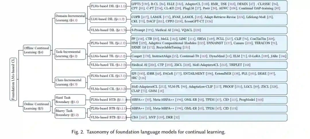 本综述系统地将这些策略和技术分类为两个核心领域:离线持续学习和在线持续学习(图2)。我们首先给出离线和在线CL的详细定义和场景,其中离线CL包括领域增量、任务增量和类别增量CL,而在线CL包括硬任务边界和模糊任务边界。这些学习策略进一步细分为基于预训练语言模型(PLMs)、大语言模型(LLMs)和视觉-语言模型(VLMs)的方法。然后,我们总结了与传统方法、持续预训练方法、参数高效调优方法和基于指令方法相关的论文。最后,我们从多个角度统计了主要数据集,并回顾了评估模型遗忘和知识转移的关键指标。