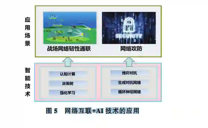 在战场互联领域,主要可在战场网络韧性通联、 网络攻防等方面应用认知计算、博弈对抗等智能技 术,实现网络优势,如图 5 所示。1)应用于战场网络韧性通联。利用人工智能 技术敏捷感知网络环境、灵活加载通信波形、自主管 控网络资源,提升战场通信网络体系韧性。近年来, 为了不断适应新的军事战略和作战形势,美军一直 在探索如何在反介入/ 区域拒止作战环境中确保灵 活、敏捷、弹性的有保障通信系统。美国空军实验室 与加拿大国防研发中心通信研发中心开展了“挑战 与对抗性环境中有保障通信”项目研究[44] ,主要针 对未来作战人员可能面临的恶劣通信条件,特别是 在偏远与服务欠缺条件下以及动态与对抗环境中, 通过开发新的概念与技术,实现灵活与自适应频谱 接入,保证鲁棒而可靠的通信能力。2017 年,DAR⁃ PA 启动了“无线电频谱机器学习系统”项目[45] ,通 过人工智能理解无线电信号,改善推广频谱共享技 术,增强无线通信能力。2)应用于网络攻防。以人工智能为武器,使恶 意攻击行为可以自我学习,并根据目标防御体系的 差异自适应地“随机应变”,通过群招潜在的漏洞达 到攻击的目的。同时,采用人工智能技术可以改善 网络安全现状,能更快地识别已知或未知威胁并及 时响应。美国斯坦福大学和 Infinite 初创公司于 2017 年联合推出了一型自主网络攻击系统,该系统 图 5 网络互联+AI 技术的应用 的核心处理单元是一种定制的人工智能处理芯 片[46] 。该新型网络攻击系统能够在特定的网络中 运行,完成信息的自主采集、学习和攻击程序的自主 编写,并且可以对攻击程序进行自适应动态调整,具 备较强的隐蔽性和破坏性。2018 年 DARPA 启动了 “利用自主系统对抗网络对手计划” 项目[47] ,旨在 建立安全可靠的网络代理,实现对僵尸网络的有效