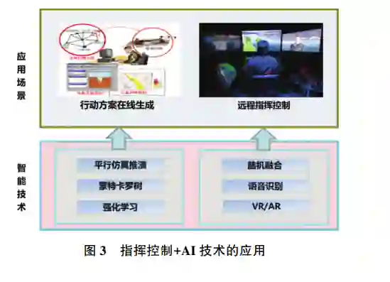 在指挥控制领域,主要可在作战方案推演、远程 指挥控制等方面应用平行仿真推演、脑机融合等智 能技术,实现决策优势,如图 3 所示。 1)应用于作战方案推演。通过深度学习技术, 训练智能体对战场交战规则、作战指挥决策、事件认 知推理等知识进行学习和模拟,提升智能体认知的 智能性、实时性与科学性。在战场态势实时共享的 基础上,对战场数据进行智能化处理,通过平行仿真 推演作战方案,形成对对手下一步可能的军事行动 和战场演进趋势的智能预测,自动匹配最佳行动策 略[35] 。2007 年,DARPA 安排了名为“深绿”的系统 研发项目[36] ,旨在建造一套人工智能作战辅助决策 系统。该系统利用平行仿真、动态博弈等技术,基于 战场实时数据,可动态模拟战场敌我双方作战行动, 并预测战场态势走向,帮助指挥官提前思考,缩短决 策时间。DARPA 于 2018 年启动了 “ 指南针” 项 目[37] ,该项目主要通过利用大数据分析、博弈对抗 等方法对战场数据进行分析,构建敌方作战行动与 路径模型,帮助作战人员确定敌方真实作战意图,制 定并选取我方最有效的行动方案。