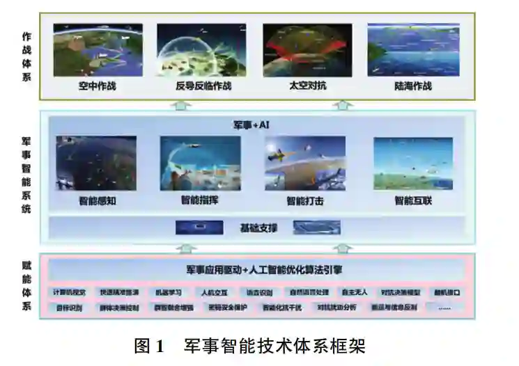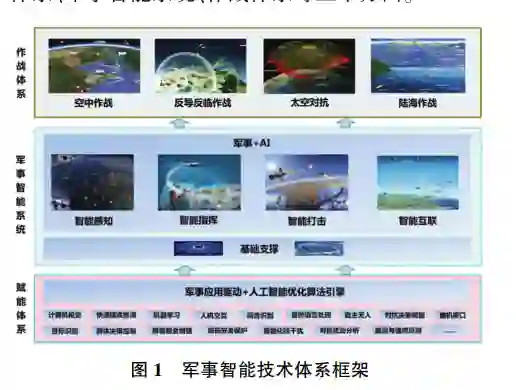 未来战争,从能力上我们希望具备更加透彻的 感知、更加高效的指挥、更加精确的打击和更加自由 的互联。由此带来的众多跨作战空间装备之间数据 互联、任务协同及海量战场异构数据实时处理等问 题必须由更加深入的智能才能得到有效的解决,继 而对感知、指挥、打击、互联等作战能力产生催化剂 的作用,形成一体化智能作战链条,颠覆性提升体系 作战效能。军事智能技术体系框架如图 1 所示,包括赋能 体系、军事智能系统、作战体系等三个方面。