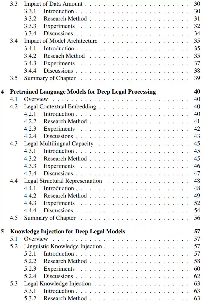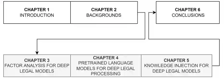 论文的大纲如图 1.2 所示。首先,我们要确认深度学习模型执行法律任务的能力,这通常需要专业知识。我们分析了数据表示、数据量和深度学习模型架构的影响。这一确认是探索深度法律处理知识的第一步。之后,我们进一步发现法律数据的哪些特征可用于预训练强法律语言模型,这是最近在自然语言处理中取得许多良好成果的多头注意力网络家族。在回答这个问题时,会涉及到法律嵌入、法律多语言能力和法律结构表示。最后,我们研究了将知识注入神经网络以获得该领域模型的性能和可解释性的可能性。研究语言知识、法律知识和自学知识来回答这个问题。