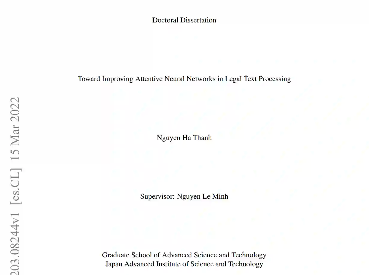 论文的最终目标是展示我们在改进法律文本处理中注意力神经网络的道路上的工作。第 3 章和第 4 章的内容是我们参与 COLIEE 的结果和观察。第 5 章介绍了初步研究,试图增强注意力神经网络的可解释性,注意力神经网络被认为是黑盒子。尽管这项工作做得很细致,但实验中可能存在盲点,对结果的解释可能存在偏差。因此,在每项工作中,我们不仅将性能量化为数字,而且对实验结果进行了更深入的分析。在每一章的最后,我们总结了该章的要点和相关的讨论。我们的最终讨论和结论将在第 6 章中介绍。本章使读者能够理解我们的贡献,将其视为改进法律文本处理中注意力模型的连贯工作。最后但同样重要的是,我们概述了可以扩大范围并将这项研究提升到实际应用的未来方向。