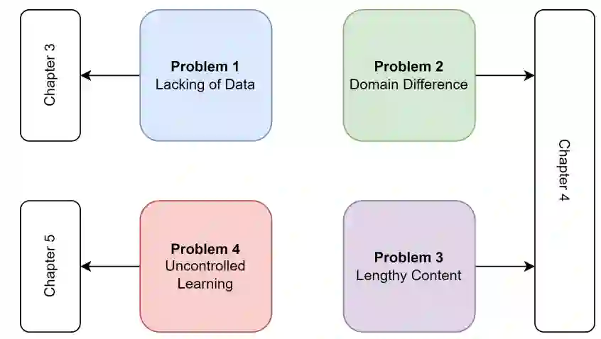 论文的主要贡献包括发现和解决了法律领域深度学习系统的4个常见问题,即数据缺失、领域差异、内容冗长和学习不受控制,如图1.1所示。除了非架构解决方案外,本文提出的模型都利用了注意力机制。论文还表明,如果没有适当的方法,注意力模型的力量可能会被浪费。这在注意力CNN、预训练语言模型和 Paraformer 部分中得到了特别证明。