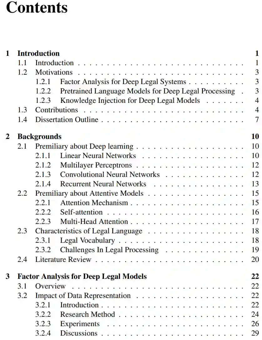 在回答研究问题之前,我们在第 1 章专门介绍了研究目标、挑战以及我们进行这项研究的动机,第 2 章介绍了深度学习、注意力机制和多头注意力模型的基本知识[62]。在撰写本文时,这些技术具有很大的影响力。这些知识不仅为读者阅读下一章提供了基础,而且有助于阐明研究的背景。这些技术将来可能会过时并被取代。但是,论文的哲学和方法论仍然具有参考价值。此外,我们还介绍了法律文件的特点、法律文件与日常文本的区别、挑战和深度学习处理法律文件的优势。