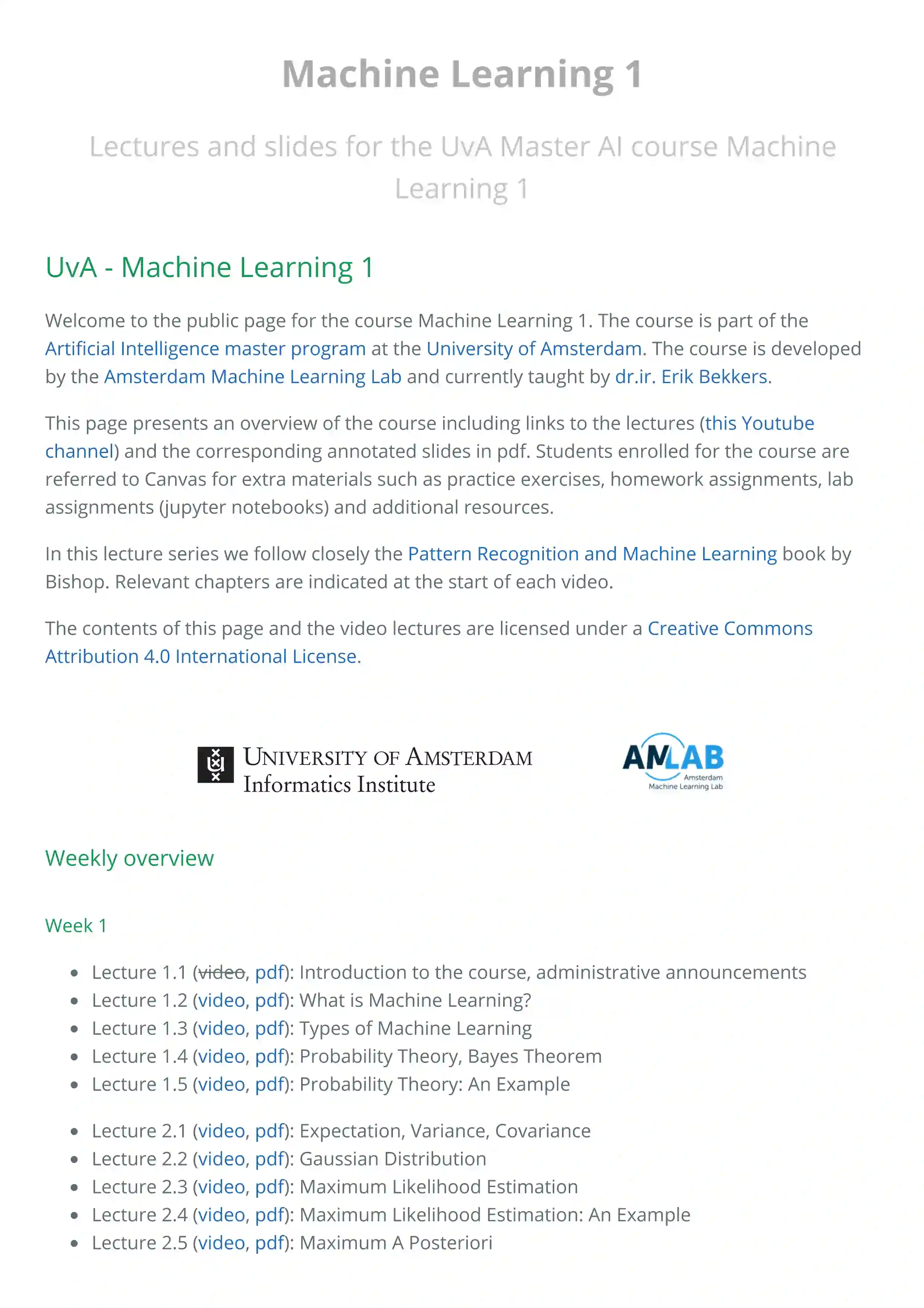 UvA - Machine Learning 1的课程主页(https://uvaml1.github.io)包括讲课的链接(Youtube频道)和相应的pdf注释幻灯片。该系列讲座密切关注Bishop的《模式识别和机器学习》一书。每个视频的开头都有相关章节。