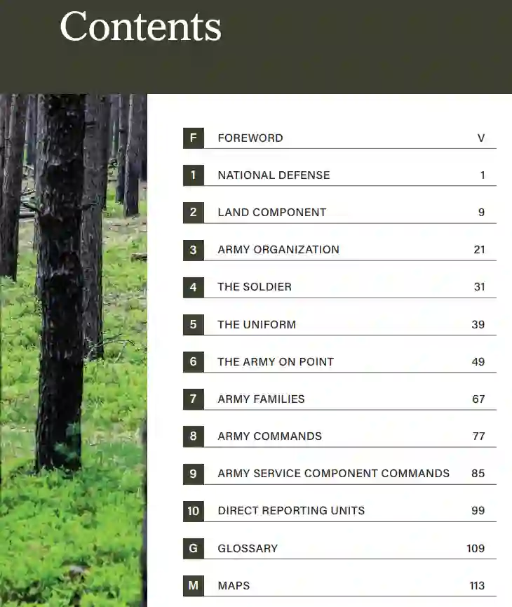 本版简介的重点是拜登总统的《临时国家战略指导》和最新的《陆军态势声明》中提出的原则。它对陆军在世界各地的行动、承诺和活动进行了更新和全面的总结,包含了有关士兵及其制服的信息和图片--包括新的陆军绿色服务制服--并描述了陆军各司令部、陆军军种司令部和直接报告单位的任务和正在进行的活动。它还配有地图,说明目前陆军司令部、军团和师、陆军国民警卫队师和陆军预备役师及职能司令部的位置。应读者的要求,本版恢复了第109页的军事缩略语词汇表。