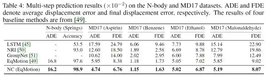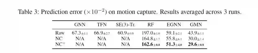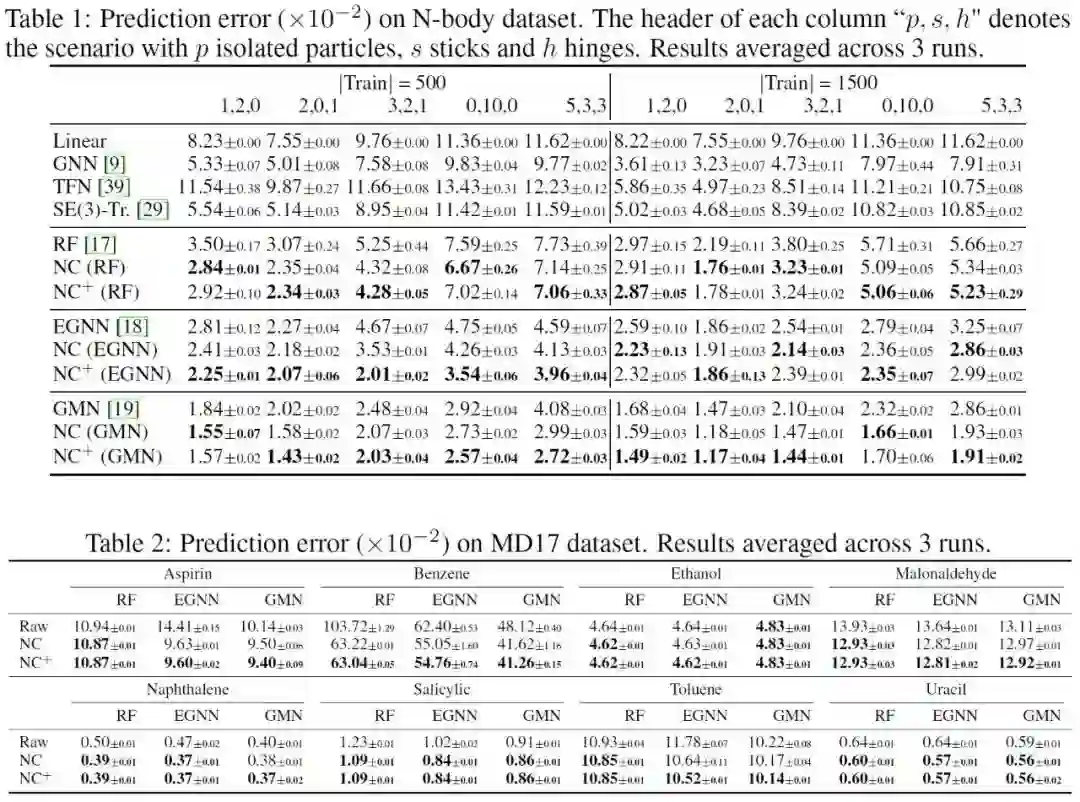 本文实验在三种不同类型的数据集上验证了NCGNN的性能:即多体系统(N-body)、分子动力学模拟(MD17)、以及人类动作轨迹(Human Motion)。本文还研究了有额外监督数据的情况NC+和无额外监督数据的情况NC,同时还考虑了不同等变图神经网络下的性能差异。