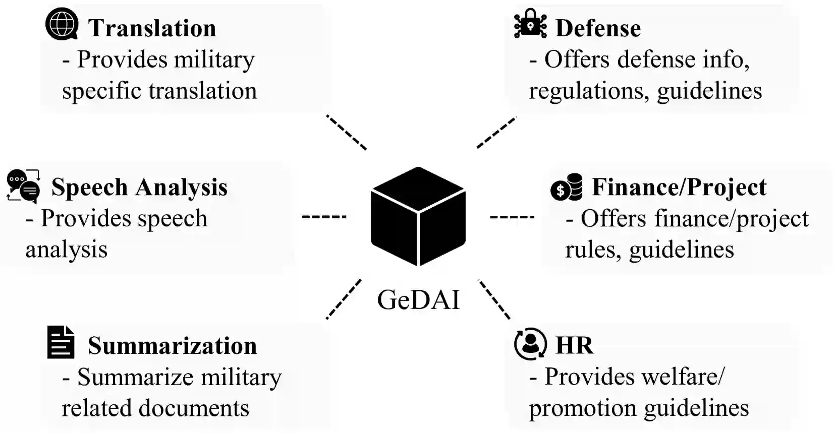 最近,许多国家已经利用人工智能来解决传统国防 M&S 中以前未曾探索过的领域。这种整合不仅解决了未知的挑战,还将以前需要大量人工和时间的任务自动化。例如,韩国国防部(MND)已经开发并正在使用一种名为 GeDAI(生成式国防人工智能)的 LLM(如图 1 所示)来简化各种流程。这种方法表明了向更高效、人工智能驱动的解决方案转变的趋势,可增强作战能力并减少关键国防任务中对人工干预的依赖。此外,GeDAI 等人工智能技术的实施有望加速国防部门的决策过程并改善战略规划。