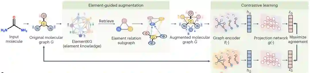 在获得ElementKG及其嵌入后,作者的目标是将其纳入预训练中,以增强模型对基础领域知识的理解。作者使用ElementKG中的基本元素知识,采用对比学习方法在大量未标记分子上预训练图编码器(具体内容在下面介绍)。用于创建正对的对比学习的传统图增强技术通常涉及删除节点或扰动边,这可能违反分子内的化学语义。为了解决这个问题并在原子之间建立更有意义的联系,作者提出了一种元素引导图增强方法来构建对比学习中的正对。如下图所示,首先识别给定分子中存在的元素类型,并从ElementKG中检索它们相应的实体和关系。这形成了一个元素关系子图,该子图使用元素的关联实体和关系来描述元素之间的关系。将子图中的元素实体节点连接到原始分子图中相应的原子节点,以创建一个增强的分子图,该分子图集成了基本的领域知识,并捕获了共享相同元素类型的原子之间的基本关联,即使它们没有直接通过化学键连接。这种方法保留了拓扑结构,同时结合了重要的化学语义。在此基础上,作者采用对比学习框架通过最大化原始分子图和增广分子图之间的一致性来训练图编码器,而不会在增广图中不加区分地嵌入元素知识。