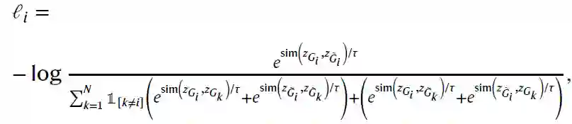 其中sim()表示余弦相似性,是温度影响参数,是潜在表示。对比损失的分子衡量正对之间的一致性,而分母计算每个图与其他2N−1个图之间一致性的总和。这意味着原始图的潜在表示不仅要考虑与其他原始图潜在向量的相似度,而且要考虑与所有增广图的相似度。增广图的潜在表示也遵循相同的计算过程。最后,计算minibatch中所有正对的损失。