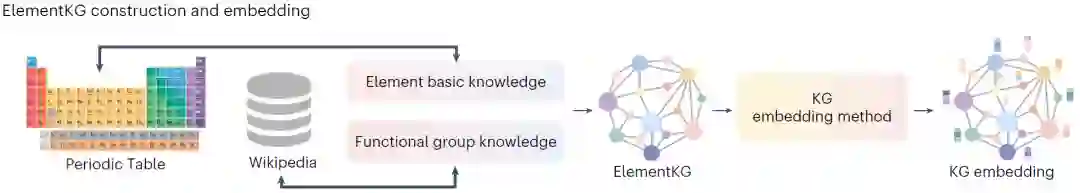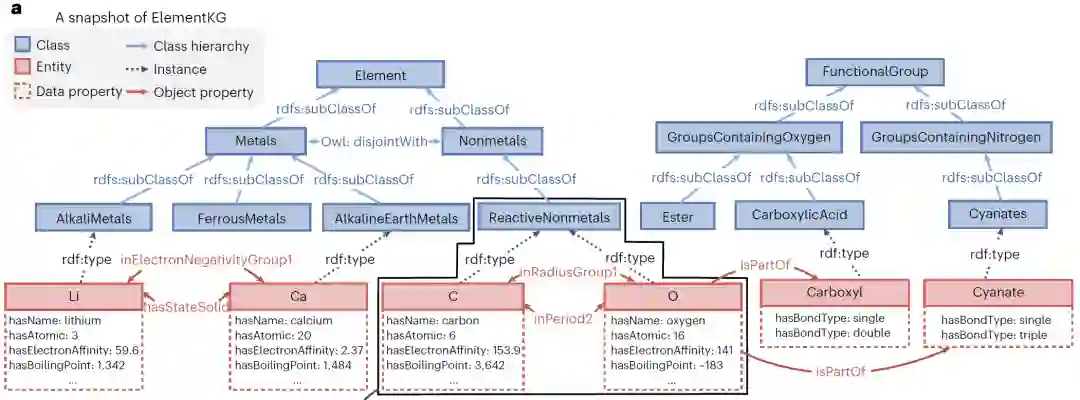 化学领域知识对分子分析至关重要,将其集成到结构化数据中可以使其更加标准化,更易于使用。一些研究人员从公共化学数据库和科学文献中建立了KG,以提取化学物质与疾病或药物对之间的关联。与这些方法相反,作者关注的是最基本的化学知识--化学元素。一个多世纪以来,元素周期表已经发展成为一个相互关联的完整的元素体系,揭示了复杂现实世界的内在规律,使化学研究实现了从现象到本质的根本飞跃。虽然最近的一项研究开发了一种包含元素及其相应化学属性的KG,但其基本关系不足以容纳全面而有序的基础化学知识。为了提供元素周期表的整体视图,作者构建了一个面向元素的KG,它梳理了元素的类层次结构、数据属性和对象属性。此外,作者认识到官能团的重要性及其与化学元素的密切关系,因此,从维基百科收集了有关官能团的相关知识,以使ElementKG更具信息性。