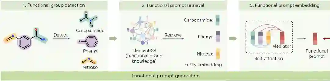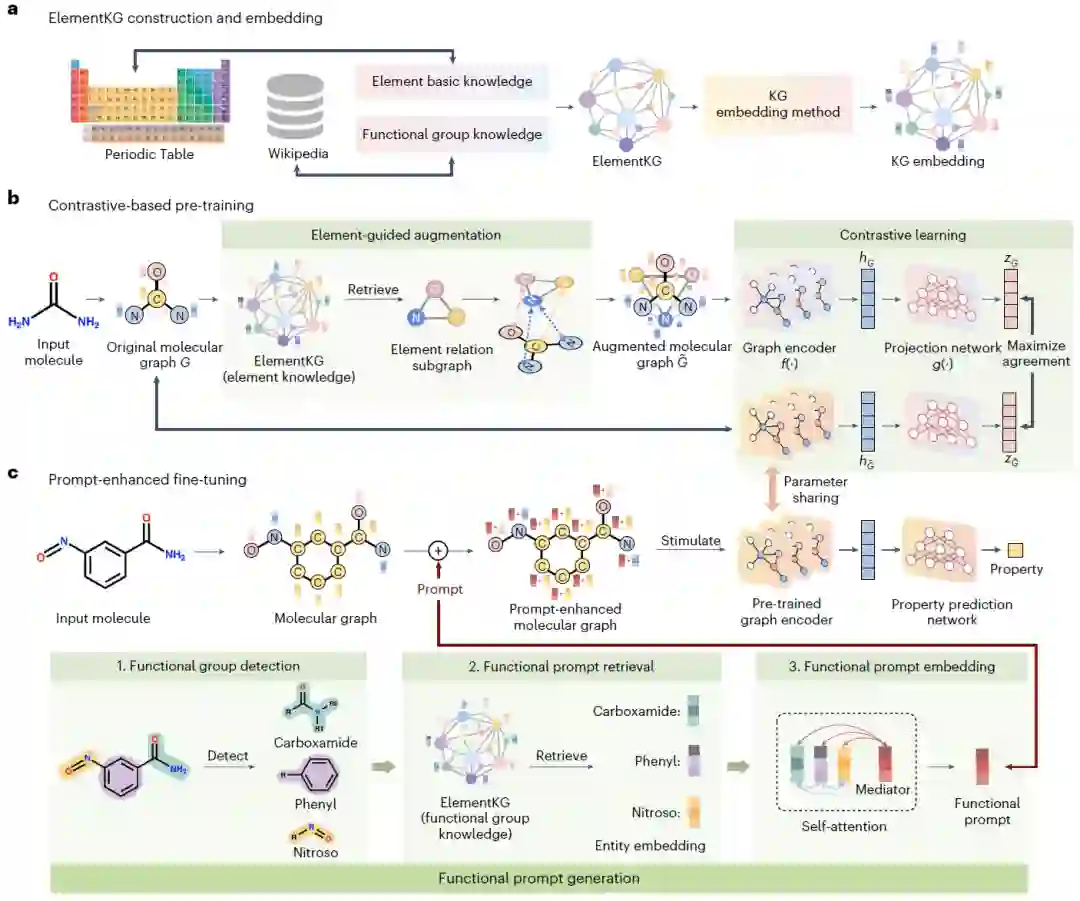 深度学习模型可以准确地预测分子性质,并有助于更快、更有效地寻找潜在的候选药物。许多现有的方法纯粹是数据驱动的,专注于探索分子的内在拓扑和构造规则,没有任何化学先验信息。高度的数据依赖性使它们难以推广到更广泛的化学空间,并导致预测缺乏可解释性。为了解决这一问题,作者引入了一个面向化学元素的知识图谱(KG)来总结元素及其密切相关的官能团的基本知识。提出了一种基于功能提示的知识图增强分子对比学习方法(KANO),在预训练和微调中利用外部基础领域知识。具体而言,以面向元素的知识图谱为先验,首先设计了在基于对比的预训练中的元素引导图增强,在不违反分子语义的情况下探索微观原子关联。然后,在微调中学习功能提示,以唤起预训练模型获得的下游任务相关知识。广泛的实验表明,KANO在14个分子性质预测数据集上优于最先进的基线,并为其预测提供了化学合理的解释。这项工作通过提供高质量的知识先验,可解释的分子表示和优越的预测性能,有助于更有效的药物设计。