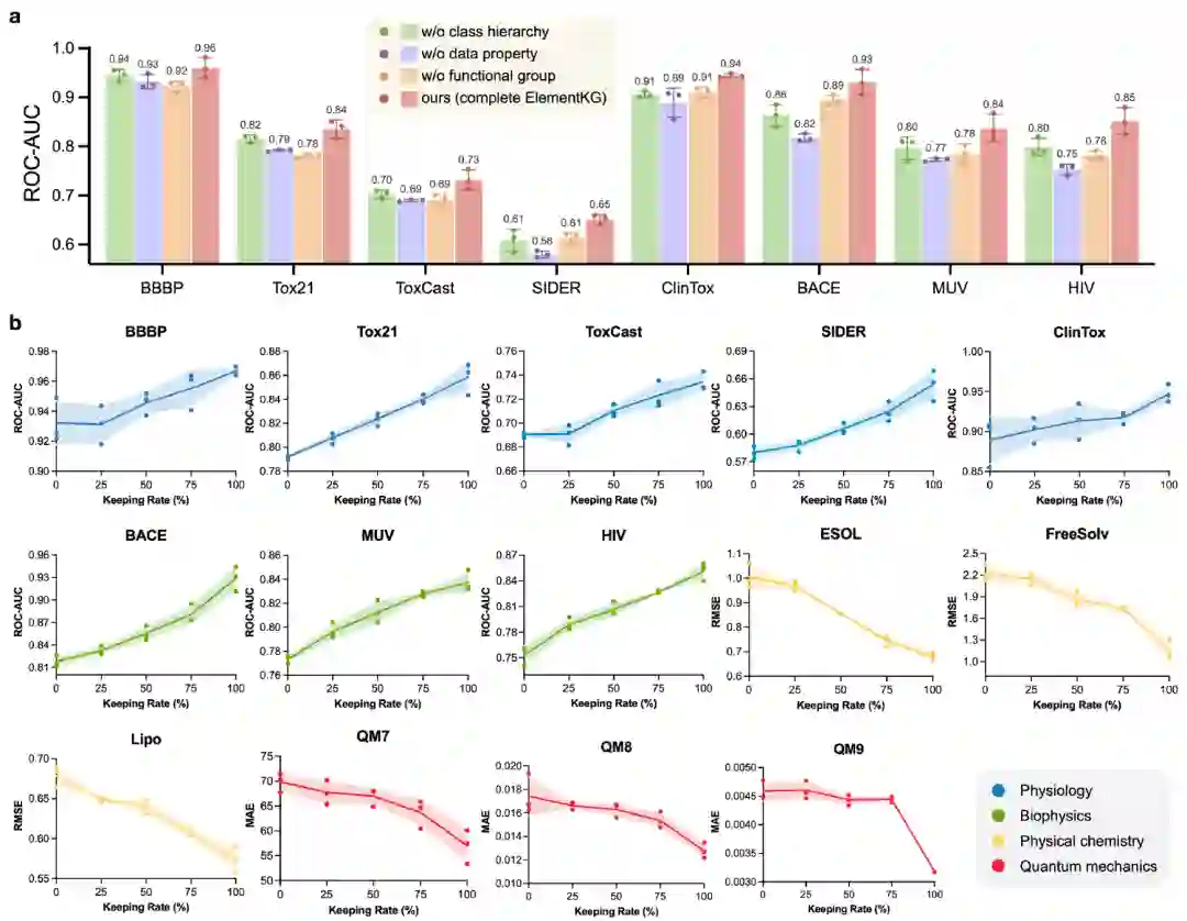 ElementKG在KANO框架中是必不可少的,因为它指导分子增强和功能提示生成。为了确定其各个组件的贡献,作者使用不同的KG组件(如类层次结构、数据属性和官能团知识)来评估KANO的性能。作者只在预训练期间修剪ElementKG的组件,并保持微调的实验设置与原始KANO方法一致。下图a显示:(1)具有完整ElementKG架构的KANO (complete ElementKG)在所有数据集上优于其他变体,突出了每个组件的不可或缺性。(2)去除类层次结构 (w/o class hierarchy)会导致性能下降,强调类划分和子类之间的传递关系在提炼和转移基础领域知识方面的重要性。(3) ElementKG中不包含官能团 (w/o functional group)会导致性能明显下降,凸显了官能团的关键作用。(4)排除实体的数据属性 (w/o data properties)几乎总是表现最差,强调化学属性的重要性。
