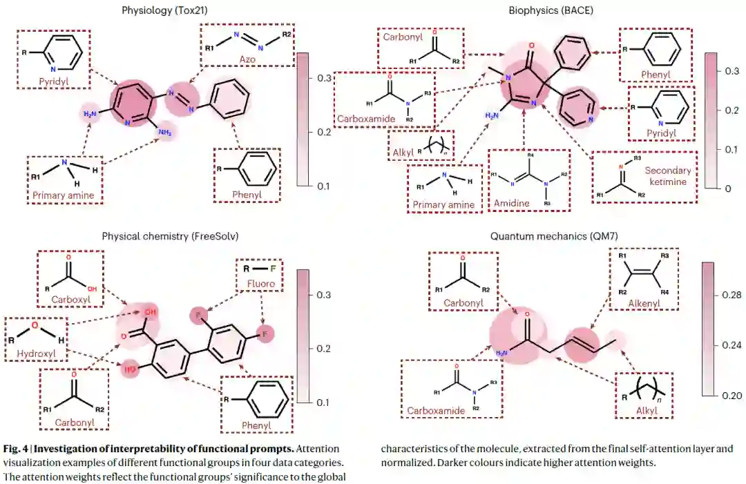 由于功能提示作为预训练对比任务和下游分子特性预测任务之间的桥梁,作者对它们提供特定领域可解释性的潜力很感兴趣。从图4的四个性质类别中可视化了分子图中官能团的注意权重。(1)第一个例子来自Tox21公共数据库,该数据库测量化合物的毒性。观察到pyridyl和azo官能团的关注度较高,其次是primary amine。有趣的是,pyridyl和primary amine可以结合形成2,6-diaminopyridine,这是继发性肝毒素和皮肤致敏剂的主要成分。含azo化合物具有致癌性和诱变性,因此具有重要意义。(2)第二个例子是BACE-1抑制剂。该分子更关注amidine,carboxamide和secondary ketimine,它们构成imidazole成分。此外,pyridyl和phenyl也受到较多关注。这些发现与先前的研究一致,表明芳香杂环家族抑制BACE-1。(3)第三个例子来自FreeSolv,主要研究水中小分子的水化自由能。Fluoro和hydroxyl受到较高的关注,因为fluoro的较强电子获取能力和hydroxyl的亲水性,影响分子与水的相互作用力。此外,极性强的carboxyl得到更多的注意力权重。(4)最后一个分子来自QM7,记录了分子的原子化能。Alkenyl和carboxamide受到更多的关注,因为碳碳双键的键能更高,而酰胺键的稳定性也更高,需要更多的能量才能将它们分解成单独的原子。可解释性探索说明了功能提示如何通过从分子性质预测任务的角度调用相关功能群知识来弥合预训练任务和下游任务之间的差距。