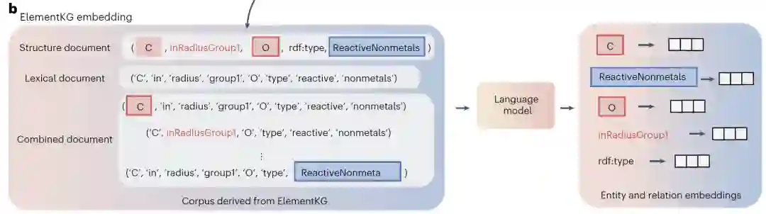 为了充分挖掘ElementKG中所有实体、关系和其他组件的结构和语义信息,获得有意义的表示,作者采用了基于OWL2Vec*的KG嵌入方法。如上图所示,该方法包括两个步骤:(1)从ElementKG中提取语料库,包括结构文档、词汇文档和组合文档;(2)在语料库上训练语言模型,以获得高质量的KG嵌入。结构文档通过计算每个目标实体的随机游走并将遍历的关系和实体组合成句子来捕获图结构和逻辑构造器。例如,从元素C开始的深度为3的随机漫步将产生以下句子(C,inRadiusGroup1,O,rdf:type,ReactiveNonmetals)。词汇文档包括从结构文档解析的句子。例如,上面的句子可以解析为('C','in','radius','group1','O','type','reactive','nonmetals')。为了建立实体及其字面名称之间的对应关系,作者将词汇文档中的每个单词替换为结构文档中的相应实体,从而生成组合文档。也就是说,上面的例子可以转换成一组句子:('C','in','radius','group1','O','type','reactive','nonmetals'), ('C','inRadiusGroup1','O','type','reactive','nonmetals')等等。将这三个文档合并为一个文档,然后使用该文档训练具有skip-gram架构的word2vec模型。最后,在ElementKG中获得每个实体和关系的嵌入,将其用于增强分子图的输入特征初始化和功能提示生成。