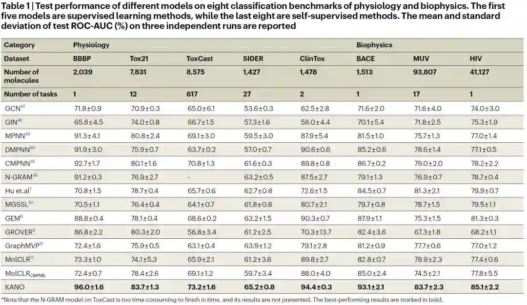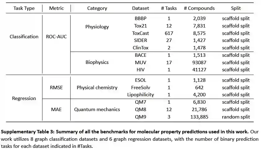 在预训练阶段,作者使用从ZINC15取样的250,000个未标记分子对KANO进行预训练。在微调阶段,作者使用了来自MoleculeNet的14个基准数据集,包括678个二元分类任务和19个回归任务。这些数据集涵盖了广泛的分子数据,如药物、生物、物理和化学。