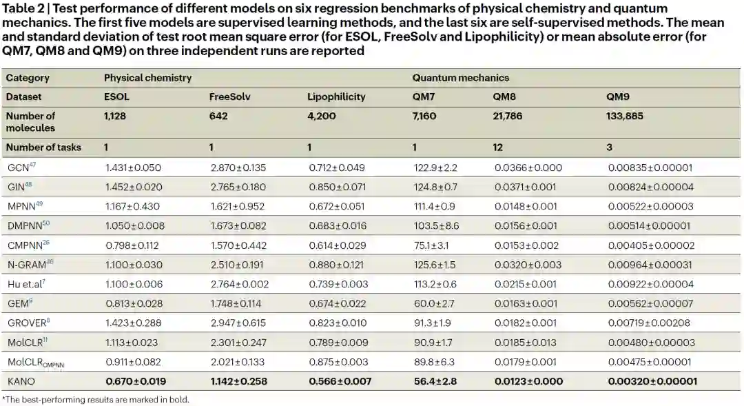 为了评估KANO的有效性,作者在四类数据集上评估了它的性能。表1和表2给出了各种方法的结果。#Molecules表示每个数据集中分子的数量,#Tasks表示每个数据集中二元预测任务的数量。表1报告了分类任务中AUC结果。主要观察结果包括:(1)KANO在所有8个数据集上的表现均优于其他方法,显著提高了3.79%,显示了其有效性。(2) KANO在Tox21、ToxCast、SIDER和MUV等多任务学习数据集上表现良好。特别是,KANO在具有617个二元分类任务的ToxCast数据集上实现了3.39%的改进。鲁棒性表明其表示涵盖了不同的分子语义。表2给出了回归任务的测试性能。主要观察结果如下:(1) KANO在监督和自监督模型中得分最高,在所有六个回归任务上都比之前的方法相对提高了15.8%。(2) KANO精细的化学理解帮助它在量子力学数据集上取得了显著的准确性,甚至超过了包含额外3D信息的模型。(3) KANO极大地帮助了标签信息有限的任务,在分别只有1128和642个标记分子的小数据集ESOL和FreeSolv上平均提高了21.7%。总之,KANO在所有基准测试中都优于其他模型,证明了将ElementKG集成到预训练和微调阶段的有效性。KANO不仅优于其他SSL方法,而且还展示了其优于监督方法的优势,为推广到更广泛的化学领域提供了竞争优势。