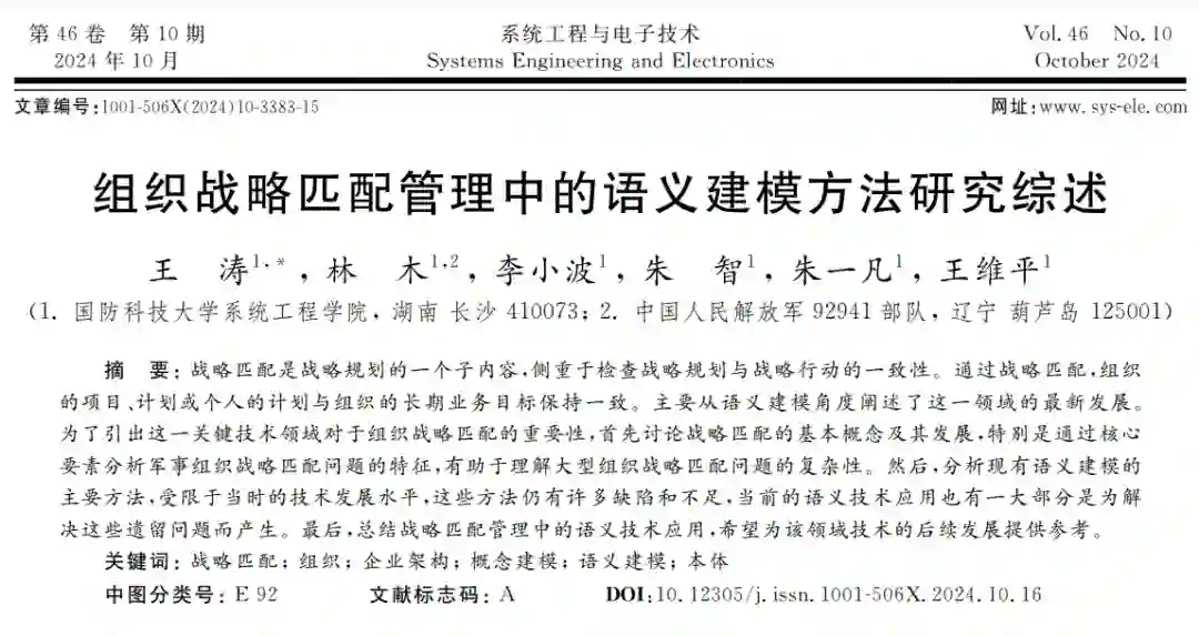 战略匹配是战略规划的一个子内容, 侧重于检查战略规划与战略行动的一致性。通过战略匹配, 组织的项目、计划或个人的计划与组织的长期业务目标保持一致。主要从语义建模角度阐述了这一领域的最新发展。为了引出这一关键技术领域对于组织战略匹配的重要性, 首先讨论战略匹配的基本概念及其发展, 特别是通过核心要素分析军事组织战略匹配问题的特征, 有助于理解大型组织战略匹配问题的复杂性。然后, 分析现有语义建模的主要方法, 受限于当时的技术发展水平, 这些方法仍有许多缺陷和不足, 当前的语义技术应用也有一大部分是为解决这些遗留问题而产生。最后, 总结战略匹配管理中的语义技术应用, 希望为该领域技术的后续发展提供参考。