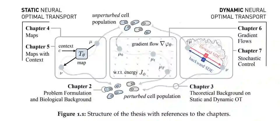 其次,我们探索了利用OT与部分微分方程和通过Jordan-Kinderlehrer-Otto方案的梯度流,以及通过扩散薛定谔桥的随机微分方程和最优控制的联系的动态神经最优传输公式。这些方法随后作为从边际观察中重建随机和连续时间动态的强大工具,允许我们剖析细粒度和时间分辨的细胞机制。