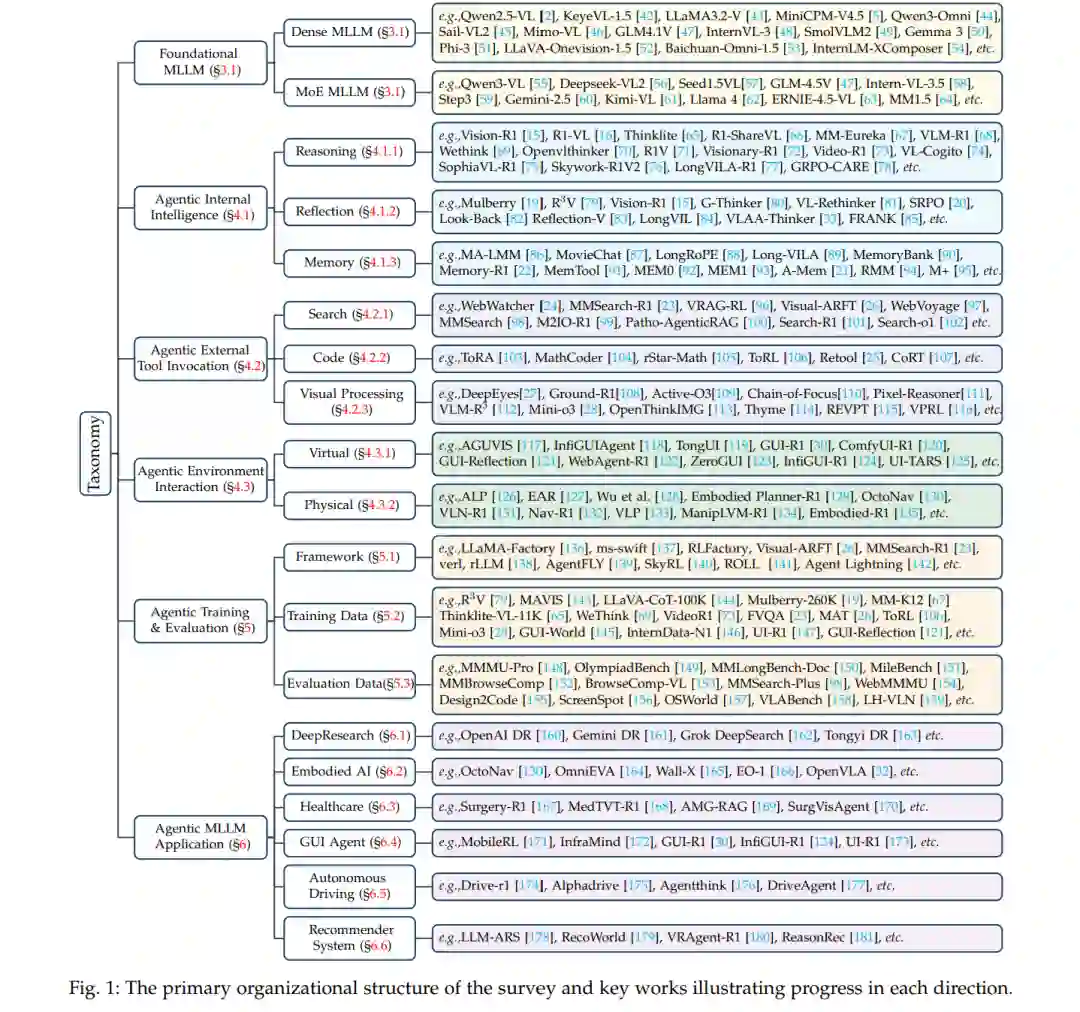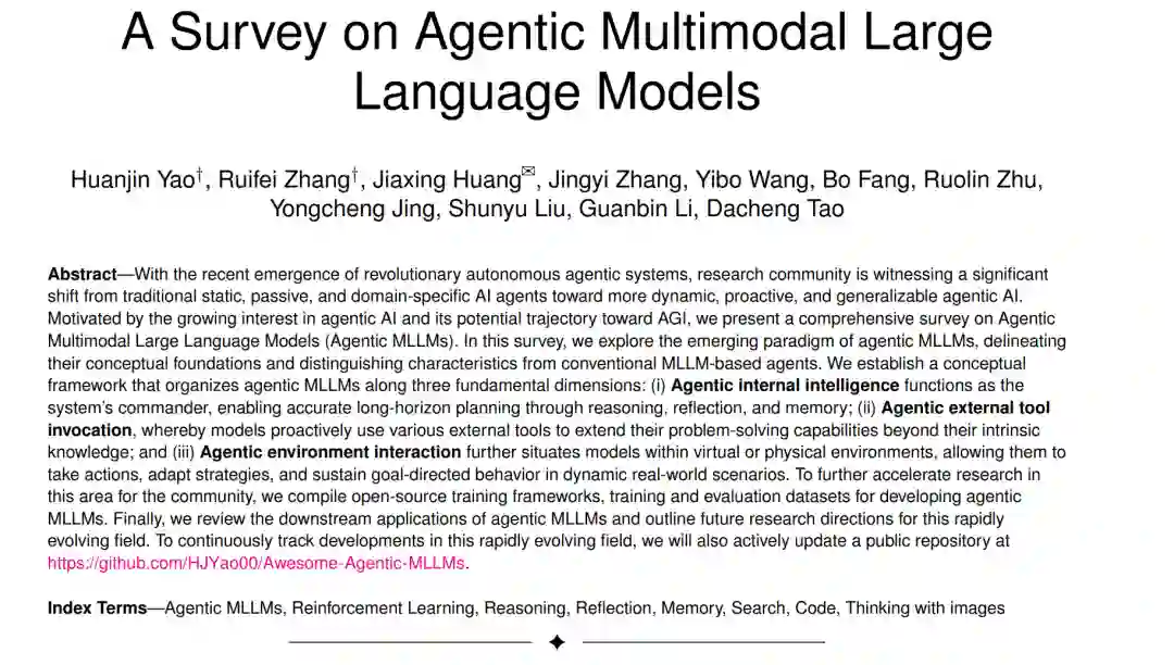 摘要——随着具有革命性意义的自主智能体系统的兴起,研究界正在经历一场显著的范式转变:从传统的静态、被动、领域特定的人工智能智能体,迈向更加动态、主动且具备泛化能力的智能体型人工智能(agentic AI)。 受智能体型人工智能的快速发展及其潜在通向通用人工智能(AGI)轨迹的启发,本文对智能体化多模态大语言模型(Agentic Multimodal Large Language Models,Agentic MLLMs)进行了全面综述。 在本综述中,我们探讨了智能体化 MLLMs 的新兴范式,阐明其概念基础,并从理论上区分其与传统基于 MLLM 的智能体的差异。我们提出了一个概念框架,将智能体化 MLLMs 的能力沿三个基本维度进行系统化组织: (i) 智能体内部智能(Agentic internal intelligence):作为系统的“指挥官”,通过推理、反思与记忆机制,实现精确的长时规划; (ii) 智能体外部工具调用(Agentic external tool invocation):模型能够主动调用多种外部工具,将问题求解能力扩展到其内在知识之外; (iii) 智能体环境交互(Agentic environment interaction):模型进一步被置于虚拟或物理环境中,使其能够采取行动、调整策略,并在动态的真实世界场景中维持目标导向的行为。 此外,为了进一步促进该领域的研究,我们整理了开源训练框架、训练与评测数据集,以支持智能体化 MLLMs 的开发。最后,本文回顾了智能体化 MLLMs 的下游应用,并展望了这一快速发展的研究方向的未来趋势。 为持续追踪该领域的最新进展,我们还在以下地址维护了一个持续更新的公共资源库: 🔗 https://github.com/HJYao00/Awesome-Agentic-MLLMs 关键词——智能体化多模态大语言模型(Agentic MLLMs),强化学习(Reinforcement Learning),推理(Reasoning),反思(Reflection),记忆(Memory),搜索(Search),代码(Code),图像思维(Thinking with images)