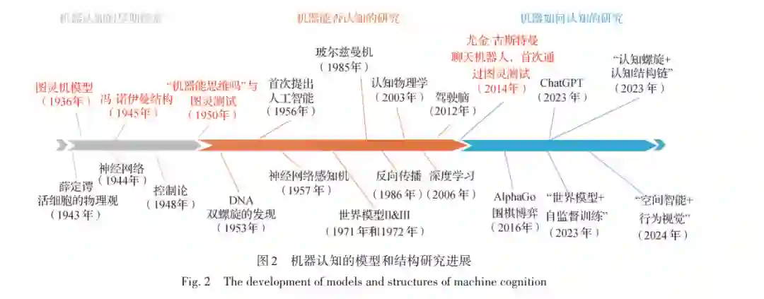 摘 要:机器如何与人一样具有认知能力?认知能力可用智能度量,人的智能是认知过程的涌现,人们从认知的模 型出发研究其结构,结构决定机器的认知功能。本文旨在探讨机器认知的模型和构建方法,为设计新一代认知机器 提供新的模型、结构和方法论。本文用分析、归纳和演绎的方法综述认知机器模型和结构的起源、演进与发展趋势。 首先,从20世纪初计算机器的发明和DNA双螺旋结构模型的发现谈起,阐述了“图灵机模型 + 冯·诺依曼结构”划时 代意义的科学研究成果的形成,这一模型和结构催生了通用计算机器的发明,并对计算机科学与技术等新学科的形 成起到奠基作用;此后,图灵的天问“机器能思维吗”及“图灵测试”对后来创立人工智能有重大启示和影响;然后评 述近20年来“深度学习模型 + 卷积神经网络结构”以及“大语言模型 + 转换器结构”等的里程碑式进展和存在的问 题;在最新进展部分综述当前国内外有代表性的3位科学家提出的模型和结构:“世界模型”、“空间智能”和“四要素 说”,特别是以“四要素说”为基础的认知物理学,为人的认知和机器认知提供了统一的理论框架,构成了机器认知的 4种基本模式——认知螺旋模型和OOXA结构链,讨论了认知核、洋葱模型和负熵概念,以驾驶脑认知为案例进行具 身智能的实验验证;最后,展望了本领域未来研究和发展趋势。模型定义了机器认知的约束边界,结构决定认知机 器的涌现性,通过模型 + 结构的研究方法和评价,为探索“人和机器认知的机制”和解决“机器如何认知”这样的人工 智能发展的重大问题提供了一种新研究视角、路径和范式。