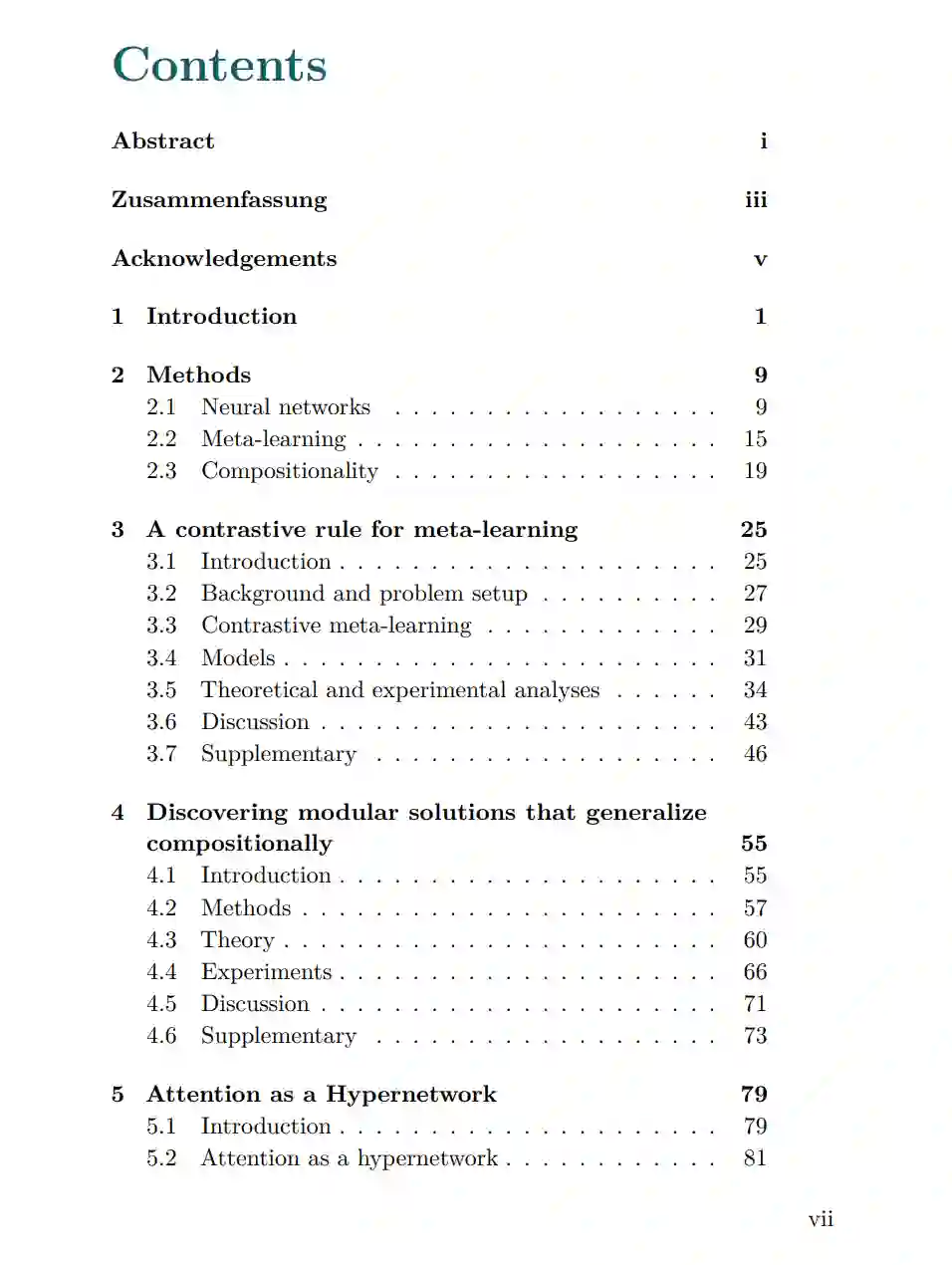 当环境变化致使既定目标难以实现时,生物体必须具备适应能力。若全然依赖生物进化来筛选更优的遗传程序,其过程将异常缓慢且低效。幸运的是,进化衍生出了“学习”机制,使个体能够基于经验调整行为,以胜任当前任务。就表象而言,学习仅指向单一任务能力的提升,且过程往往滞后。然而,人类频繁置身于全新情境,需不断重塑适应性。关键在于,新任务鲜有完全未知者;学习具有相似背景的任务通常事半功倍。这表明我们能够识别任务间的共有结构,形成泛化表征,并持续优化学习策略。 本论文旨在探讨此类能力在神经网络中的实现机制。具体而言,我们聚焦于元学习(Meta-learning)——即在接触大量具有共享结构的任务过程中,优化学习算法本身的能力。此外,本文重点探究了任务间的一种特定结构属性:组合性(Compositionality),即通过少量核心组件的重新排列组合,生成多样化任务的能力。 本文首先阐述了相关研究的数学基础,详细论证了神经网络中的元学习如何被形式化为层级优化问题(Hierarchical Optimization)或序列建模问题(Sequence Modeling)。随后,我们对任务族的“组合性”给出了形式化定义,并据此界定了组合泛化(Compositional Generalization)的研究目标。基于此背景,本文分为以下三个研究部分: 1. 算法层面: 提出了一种基于双层优化(Bilevel Optimization)的简洁且精确的元学习算法。相较于传统算法需进行反向传播时间梯度计算或二阶导数评估,该方法通过对比两次学习结果,利用局部元塑性规则(Meta-plasticity Rules)即可获取元梯度。 1. 架构层面: 研究了模块化架构(Modular Architectures)在捕捉任务族组合结构中的作用。本文从理论上刻画了超网络(Hypernetworks)——即为目标网络动态生成权重的神经网络——实现组合泛化的必要条件,并通过实验证明,在满足特定条件时,模块化架构而非**整体式架构(Monolithic Architectures)能够学习到具备组合泛化能力的策略。 1. 模型机制: 探讨了 Transformer 在处理序列化组合任务时的元学习表现。我们建立了 Transformer 的多头注意力机制(Multi-head Attention)与超网络之间的形式化联系。结果表明,Transformer 能够通过隐式超网络的潜码(Latent Code)**对操作进行重用与重组。实验验证显示,该功能性结构化的潜码能够有效预测模型在未知任务组合中所调用的子任务。