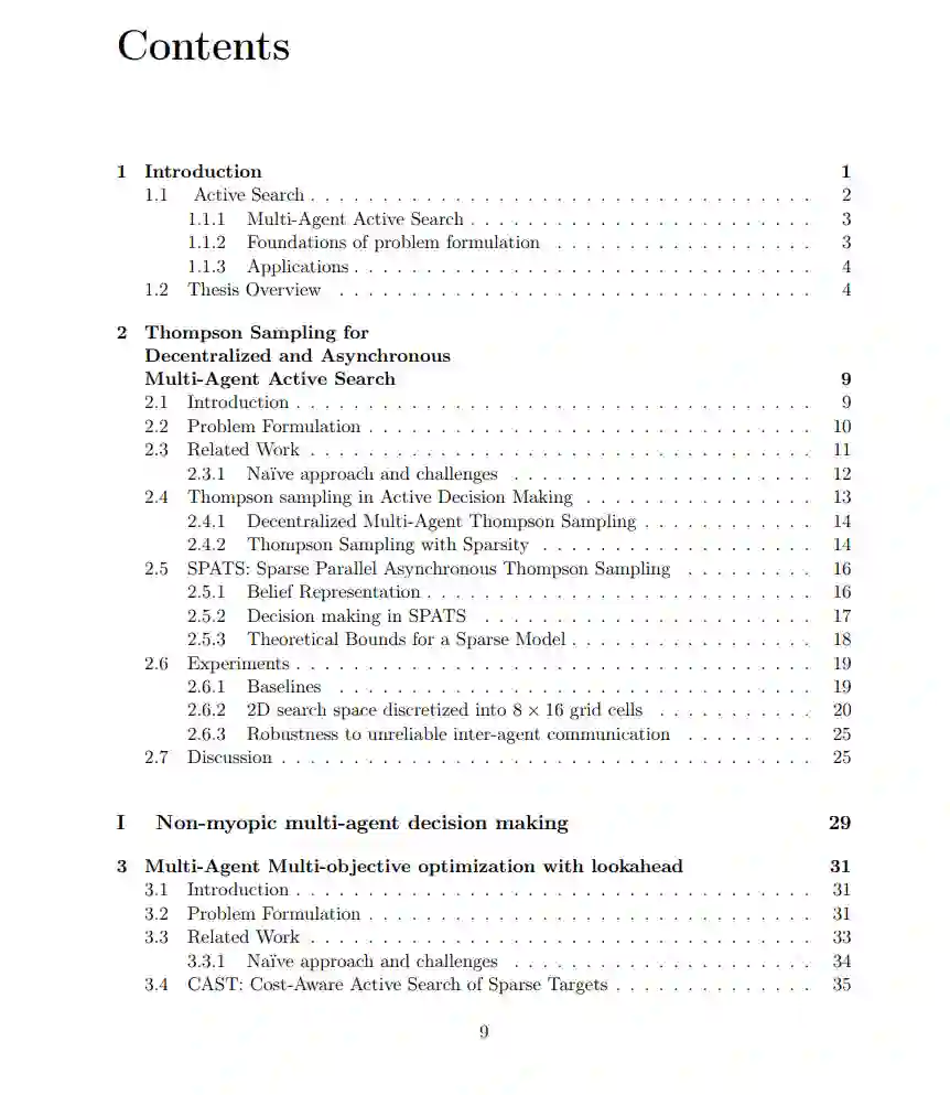 本论文第一部分研究了在MAAS中使用Thompson采样和蒙特卡洛树搜索(Monte Carlo Tree Search)进行非短视(non-myopic)前瞻性决策的优势。同时,我们还引入了面向成本的多目标帕累托优化(Pareto optimization)框架,用于主动搜索问题,并指出该问题在部分可观测、去中心化的多智能体决策及其组合状态-动作空间的计算复杂性方面所面临的挑战。