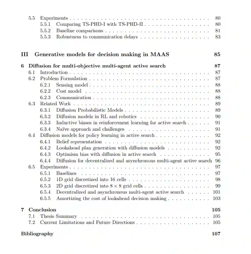 第二部分聚焦于观测噪声和目标动态性所带来的实际挑战,并提出了基于贝叶斯滤波(Bayesian filtering)的算法。实验结果表明,不确定性建模对于推理和决策过程的重要性不容忽视。 第三部分则转向用于决策制定的生成模型,特别是**在存在观测噪声的前瞻性MAAS中采用去噪扩散采样(denoising diffusion sampling)**方法。最后,我们探讨了上述方法在机器人多智能体决策以及其他具有类似现实约束的应用中的可行性与局限性。