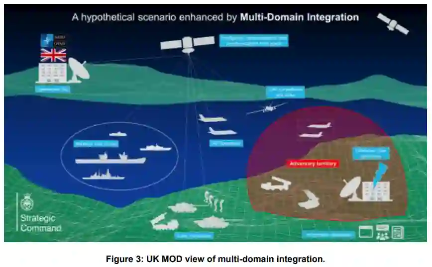 在互联网上快速搜索 "数字孪生",就能看到许多案例研究,提供了一系列极好的使用案例。在北约范围内(甚至在各国独立运作的情况下),必须重申的是,单个平台(如舰船、飞机和装甲战车)及其单独采购的子系统(如导弹和雷达)并非独立运作。它们是在互操作性越来越强的多域一体化作战概念[3](图 3)下,作为系统方法的一部分,相互组合发挥作用。这适用于设计概念的早期阶段,从测试和评估到现役运行,直至报废。
