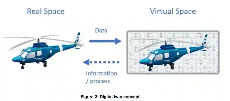 图 2 给出了一个图解概念:有一个真实的实体资产,在本例中是一架直升机,同时还有一个虚拟的代表或孪生体,作为直升机内部系统的模型而存在。虚拟孪生系统和实体孪生系统每隔一段时间交换一次数据,以便做出有用的决策。