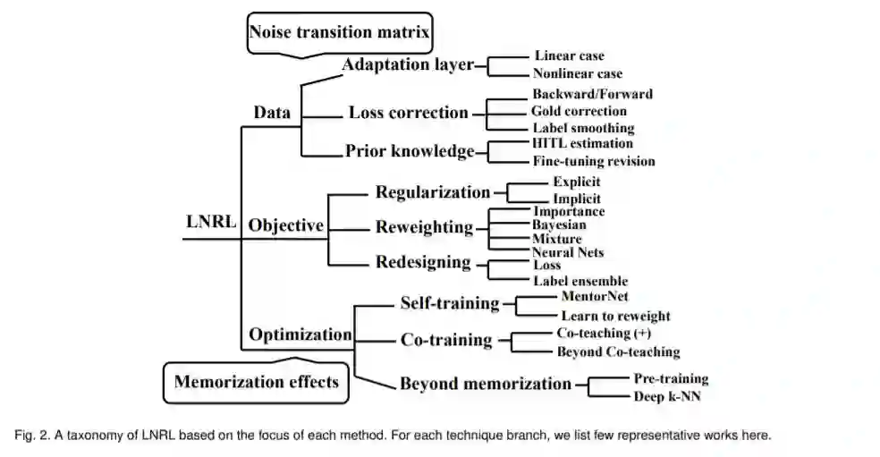 经典的机器学习隐含地假设训练数据的标签是从一个干净的分布中采样的,这对于真实的场景来说限制太大了。然而,基于统计学习的方法可能不能很好地训练深度学习模型。因此,迫切需要设计标签噪声表示学习(LNRL)方法对带噪声标签的深度模型进行鲁棒训练。为了充分了解LNRL,我们进行了综述。我们首先从机器学习的角度阐明LNRL的形式化定义。然后,通过学习理论和实证研究的视角,找出了噪声标签影响深度模型性能的原因。在此基础上,我们将不同的LNRL方法分为三个方向。在这个统一的分类法下,我们将全面讨论不同类别的优缺点。更重要的是,我们总结了鲁棒的LNRL的基本组件,它们可以激励新的方向。最后,我们提出了LNRL可能的研究方向,如新数据集、实例依赖的LNRL和对抗性LNRL。最后,我们展望了LNRL之外的潜在方向,比如使用特征噪声、偏好噪声、领域噪声、相似性噪声、图形噪声和演示噪声进行学习。