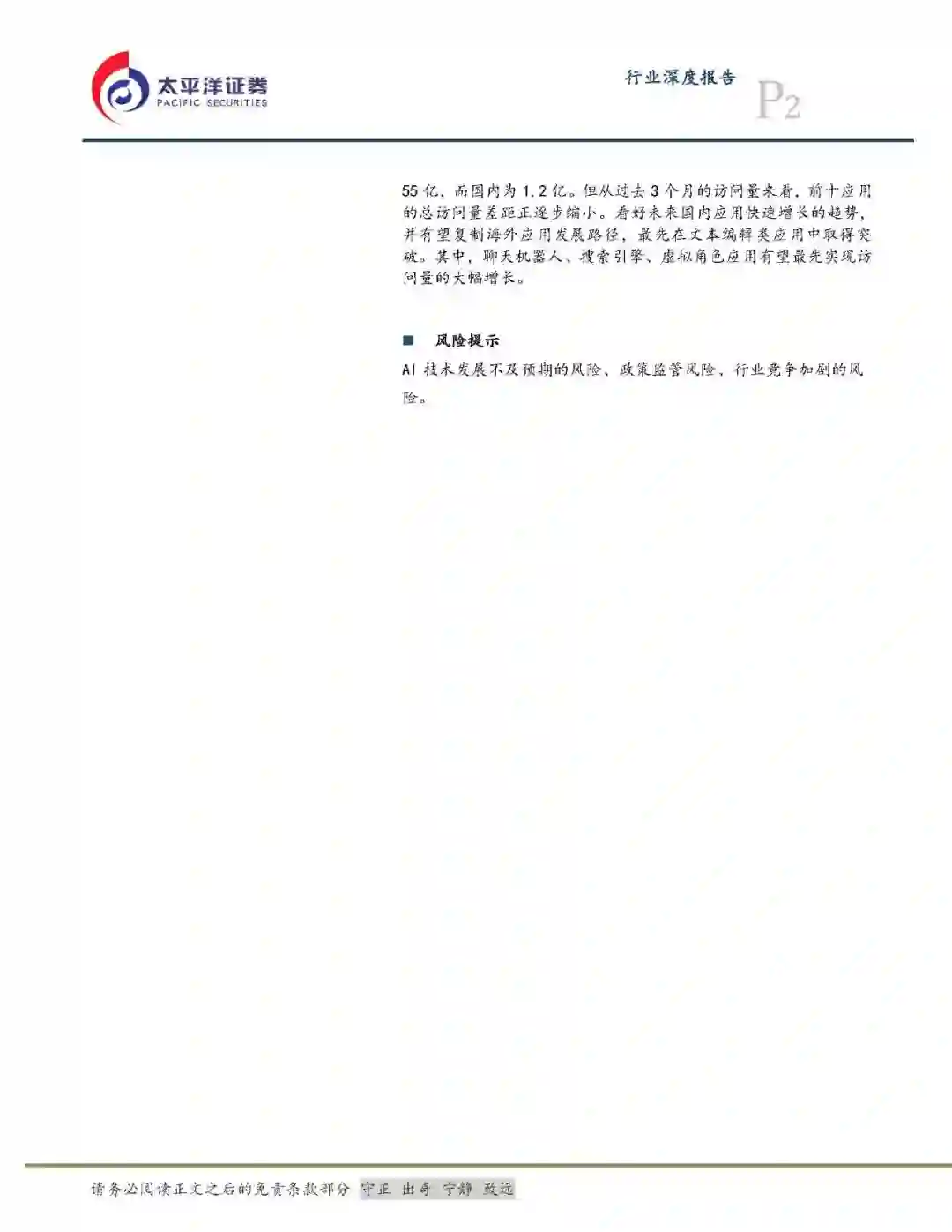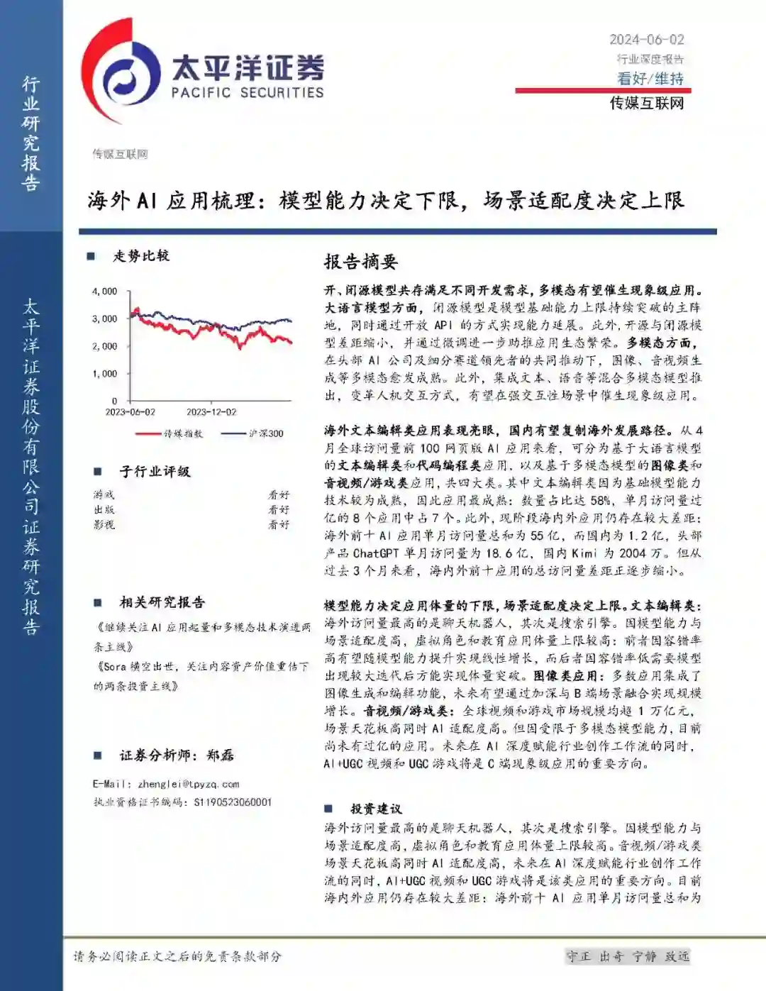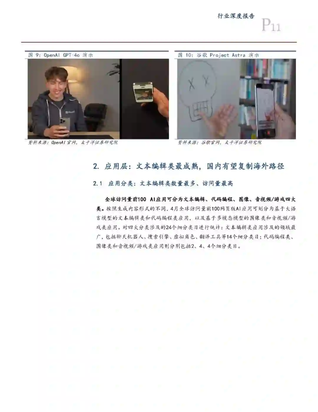 海外文本编辑类应用表现亮眼,国内有望复制海外发展路径。从4月全球访问量前100网页版AI应用来看,可分为基于大语言模型的文本编辑类和代码编程类应用,以及基于多模态模型的图像类和音视频/游戏类应用,共四大类。其中文本编辑类因为基础模型能力技术较为成熟,因此应用最成熟:数量占比达58%,单月访问量过亿的8个应用中占7个。此外,现阶段海内外应用仍存在较大差距:海外前十AI应用单月访问量总和为55亿,而国内为1.2亿,头部产品ChatGPT单月访问量为18.6亿,国内Kimi为2004万。但从过去3个月来看,海内外前十应用的总访问量差距正逐步缩小。 模型能力决定应用体量的下限,场景适配度决定上限。文本编辑类:海外访问量最高的是聊天机器人,其次是搜索引擎。因模型能力与场景适配度高,虚拟角色和教育应用体量上限较高:前者因容错率高有望随模型能力提升实现线性增长,而后者因容错率低需要模型出现较大迭代后方能实现体量突破。图像类应用:多数应用集成了图像生成和编辑功能,未来有望通过加深与B端场景融合实现规模增长。音视频/游戏类:全球视频和游戏市场规模均超1万亿元,场景天花板高同时AI适配度高。但因受限于多模态模型能力,目前尚未有过亿的应用。未来在AI深度赋能行业创作工作流的同时,AI+UGC视频和UGC游戏将是C端现象级应用的重要方向。
