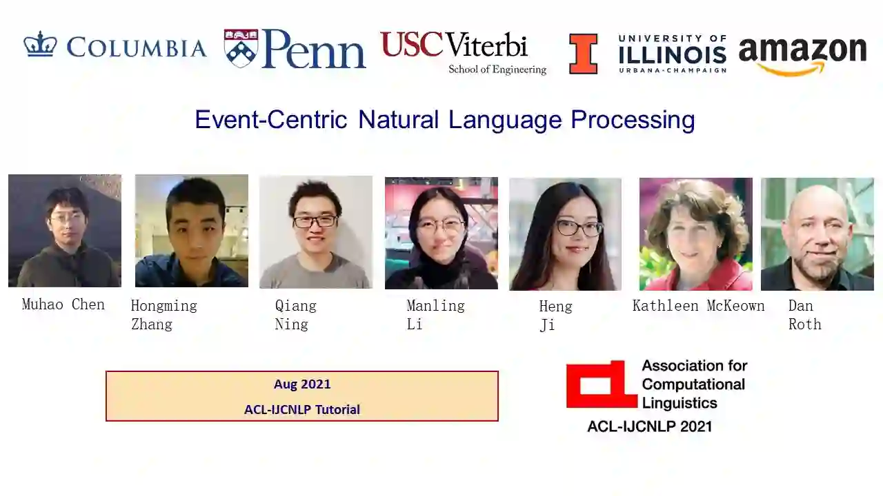 在本教程中,我们将全面回顾文献中关于以事件为中心的知识表示的现有范式,并关注它们对NLU任务的贡献。除了引入用于事件抽取的部分标签和无监督学习方法外,我们还将讨论最近用于从文本中抽取多面事件-事件关系的约束学习和结构化推理方法。我们还将回顾最近用于事件预测任务的数据驱动方法,包括事件过程归纳和概念化,以及以事件为中心的语言模型如何有利于叙事预测。此外,我们将说明远距离监督方法如何帮助解决时间和因果常识对事件的理解,以及如何运用它们来构建大规模的事件知识库。参与者将了解这个主题的最新趋势和新出现的挑战,代表性工具和学习资源,以获得即用模型,以及相关模型和技术如何使最终使用NLU应用程序受益。