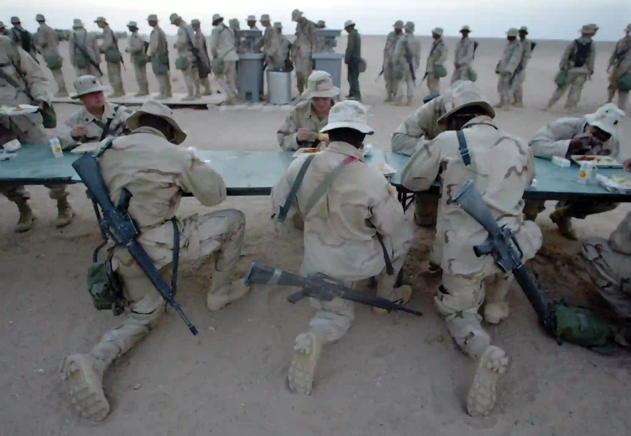 图:2003 年 3 月,伊拉克自由行动开始前,第三步兵师士兵在科威特沙漠中用餐。(照片由第三步兵师提供)