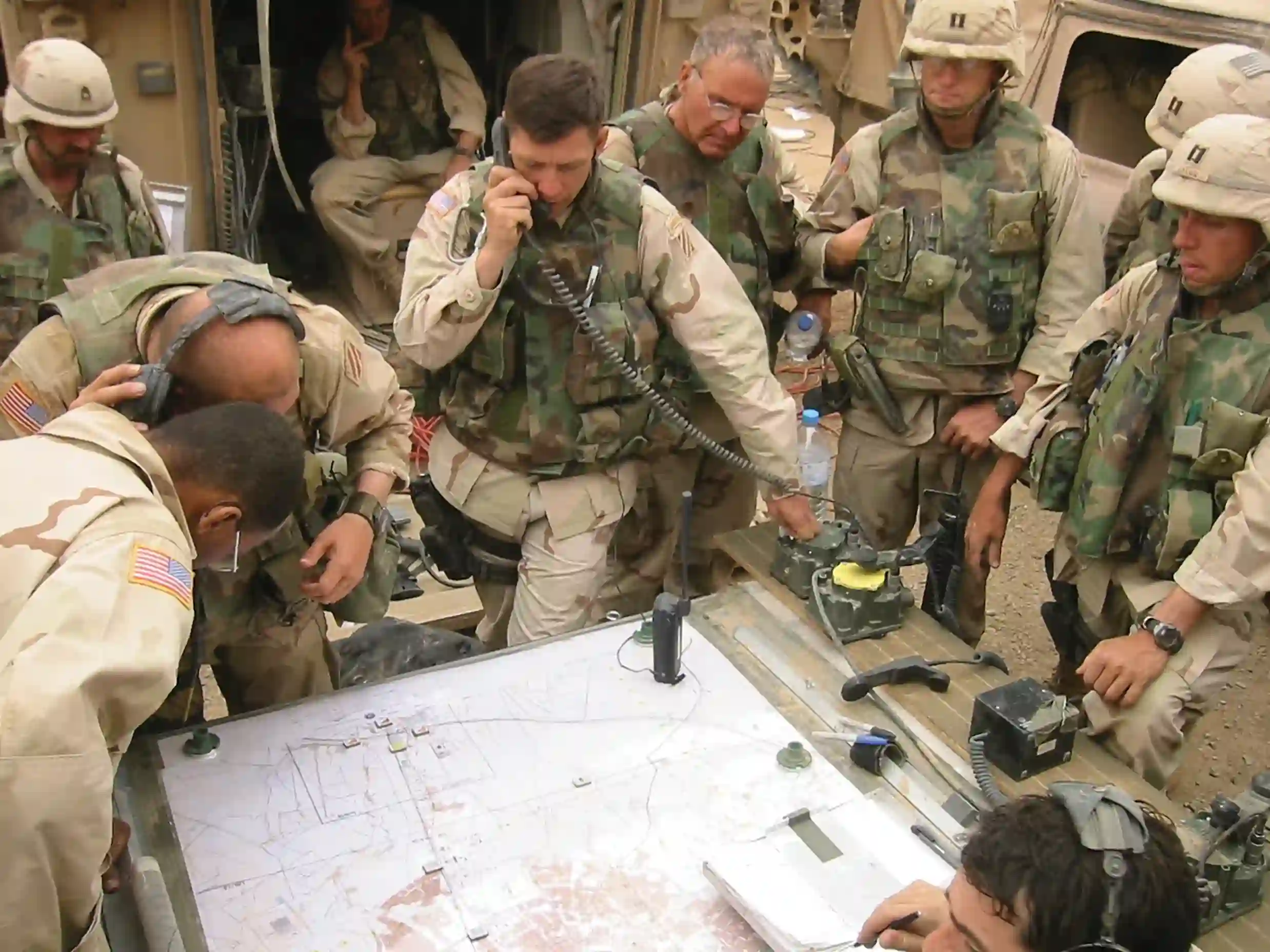 图:2003 年 4 月 7 日,巴格达附近,第 3 步兵师第 2 旅的旅执行官 Eric Wesley 中校在原旅战术行动中心遭火箭弹袭击后匆忙建立的战术行动中心 (TOC) 领导战斗。(照片由退役美国陆军 Eric Wesley 中将提供)