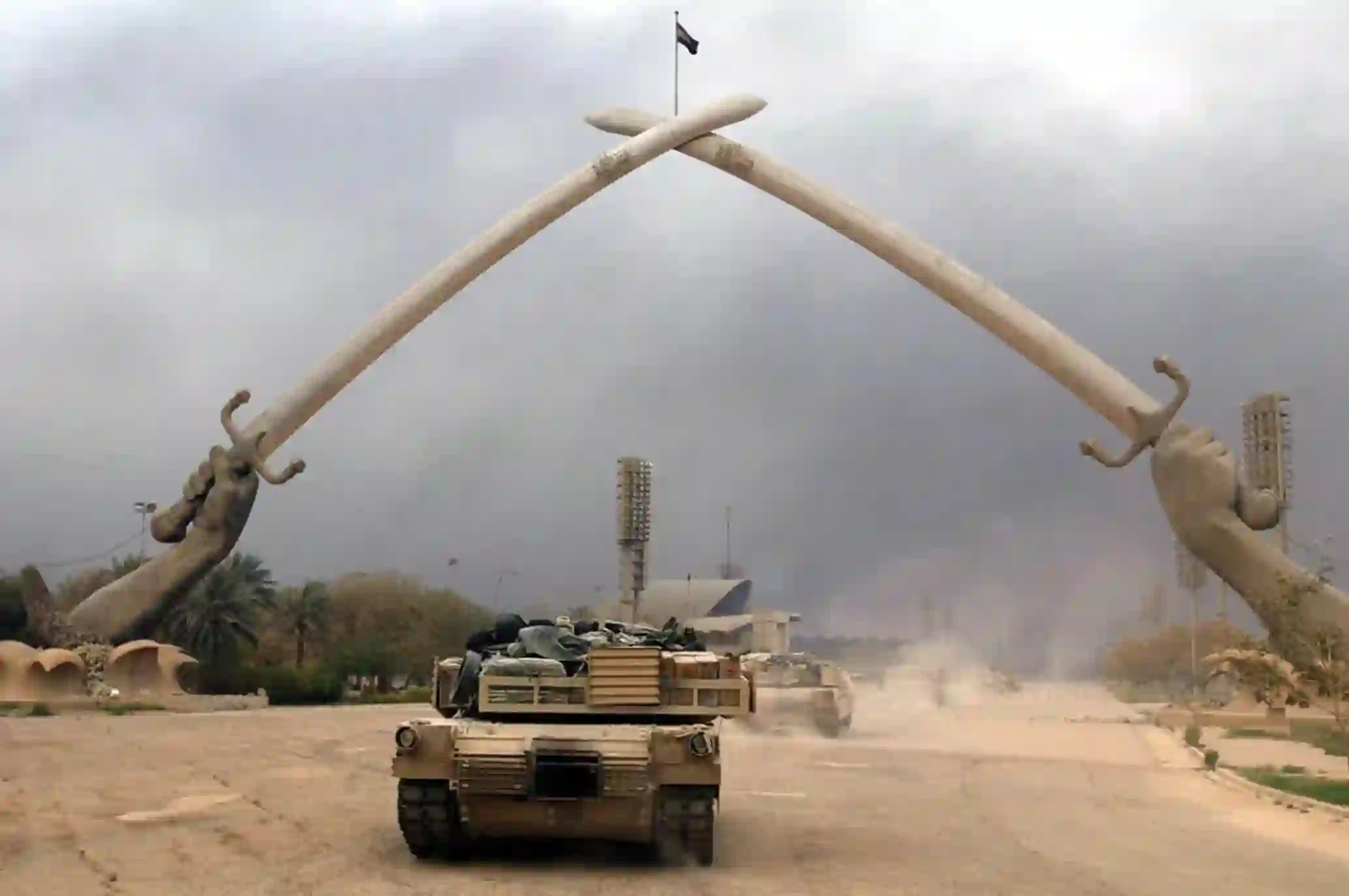 图:2003 年 4 月 7 日,第 3 步兵师第 64 装甲团第 1 营 Charlie 连开进巴格达市中心。(亚特兰大日报-stitution》记者布兰特-桑德林拍摄)