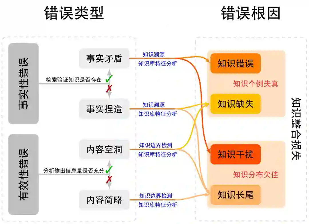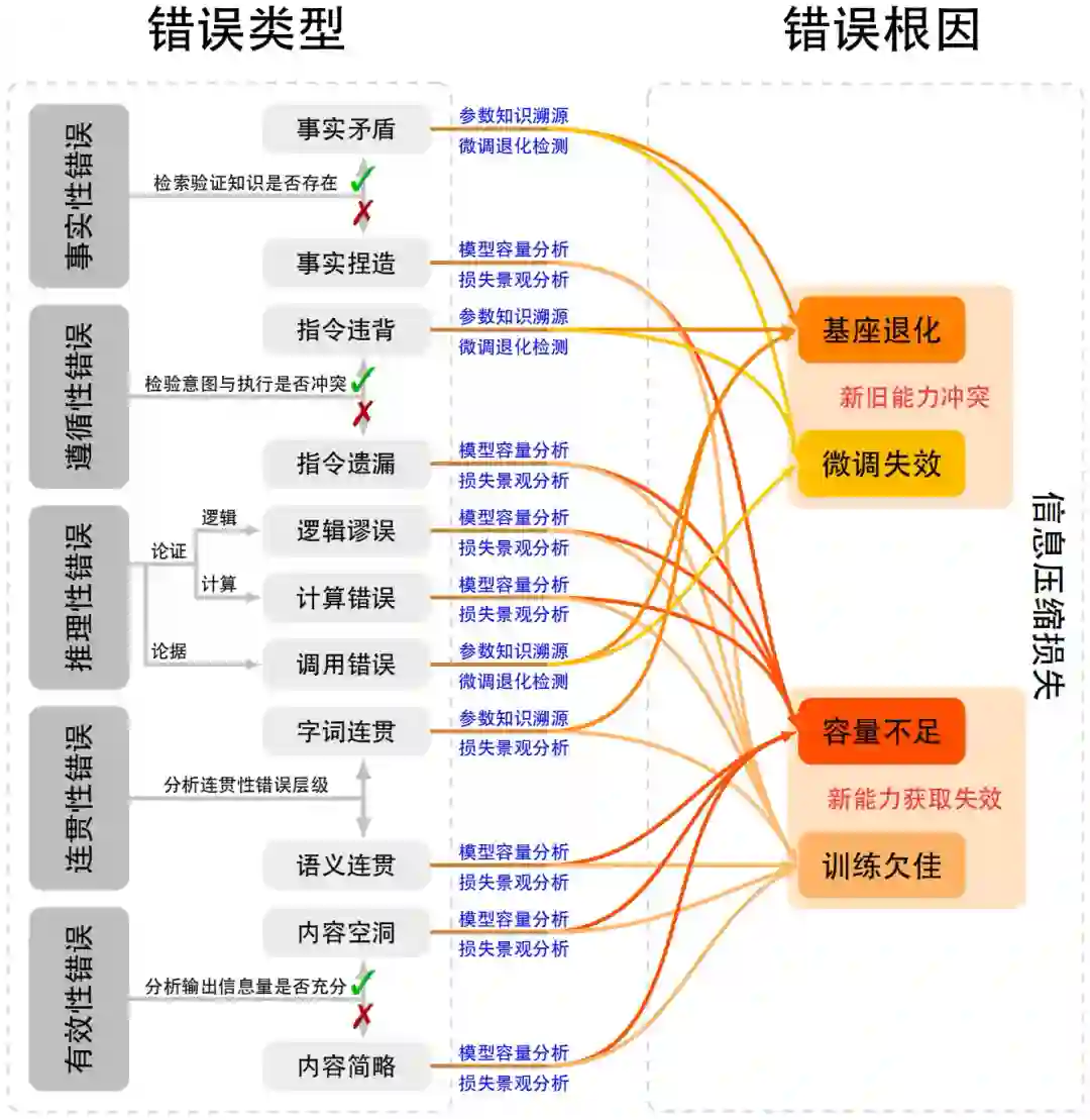 表2:错误类型具体样例 3. 基于信息损失的错误根因分析 大模型错误的根因是指导致大模型输出偏离正确目标的潜在机制性因素中产生决定性影响的内在动因。与作为可观测现象的大模型错误相比,大模型错误根因无法直接获取,而是依赖大量分析工具沿着因果链条向大模型内部机制溯源。随着溯因分析的深入,错误根因往往会与错误缓解手段产生直接关联。关于大模型错误根因与错误的具体区别主要体现为:二者分别处于机制层与现象层,对应“为什么会错”与“错在了哪里”。错误是可观测输出偏差,其判定依赖将模型输出与人类预期比较,例如人类可以轻易发现模型输出推理链条中的漏洞;错因是内部机制,其确认依赖因果诊断而非仅凭表层比对,例如需要判定某种错误根因的类型需要有对该机制相关变量进行控制性改变并能稳定地对模型错误产生一致的观测结果。由此导出三个可操作的区分准则:(1) 可观测性:错误可由输出与预期直接判定,错因需通过机制证据或干预验证;(2) 可修复性:错因往往对应修复手段,而错误不具备可修复下;(3) 再现性:错因在有效的观测手段下一般稳定可复现,而错误受到大量因素干扰存在一定的随机性。在研究大模型错误的根因时,我们从大模型完整部署周期中信息流动与损失的视角出发,提出一种基于信息损失区间的根因分类体系。该体系认为,大语言模型从知识获取、参数化学习到指令理解与知识表达的全过程,构成了一条连续的信息传递链。真实世界知识被采样为知识库,通过模型训练被压缩进参数空间,再经由用户输入激活、解析、推理并输出为自然语言结果。任何环节的信息丢失、失真或偏移,都会在最终输出层面表现为不同类型的错误。因此,我们将大模型错误的根因划分为四个主要的信息损失区间:知识整合损失、信息压缩损失、指令理解损失与知识表达损失。这一分类框架以信息论为基础,强调错误并非孤立的输出偏差,而是信息在流经不同阶段时发生衰减与变形的结果。完整流程如图 2所示。