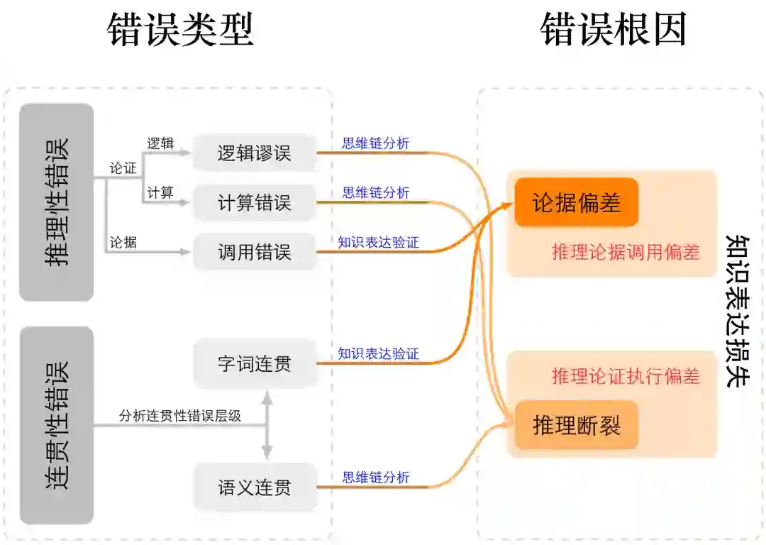 图6:知识表达损失根因细化图 如图 6所示,我们依据思维链在生成过程中的分解方式,将知识表达损失划分为两类根因:推理过程中的论据调用偏差与论证执行偏差。前者对应推理链条的步骤出错,后者对应最终推理总结的结果出错,两者共同构成了模型语言生成失真的核心机制。