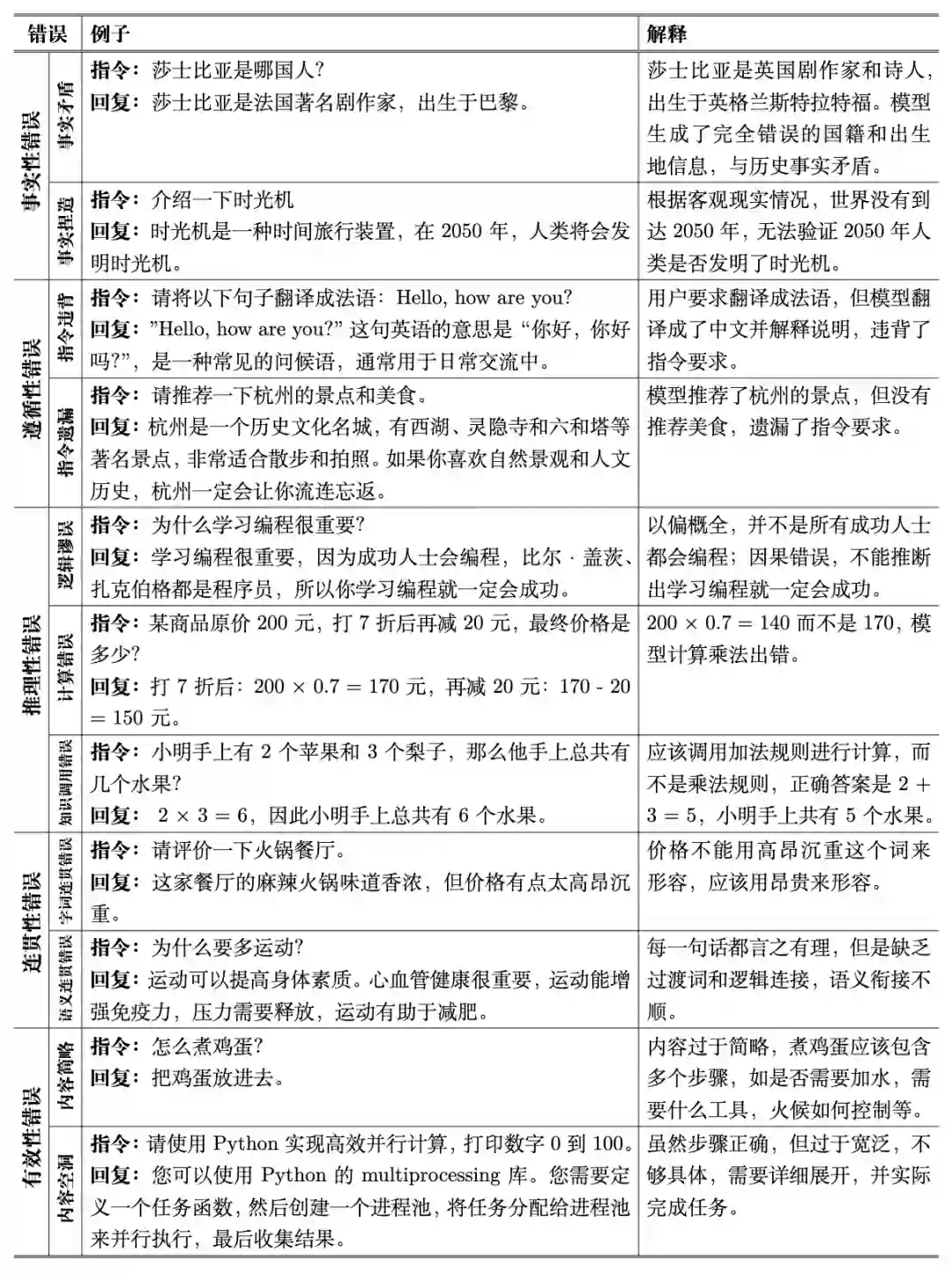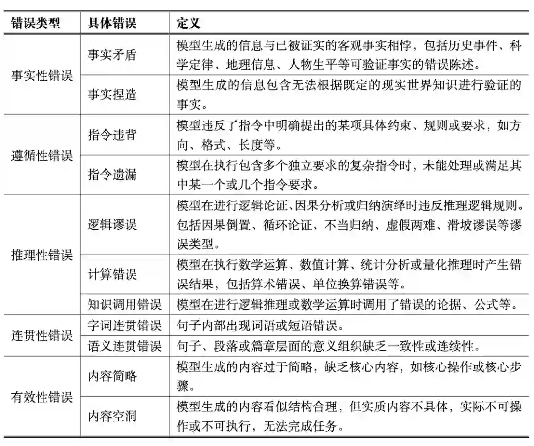 随着大语言模型在自然语言理解和生成任务中展现出前所未有的能力,其输出的质量和可靠性成为学术界和工业界高度关注的问题。然而,由于模型的训练数据、生成策略以及内部机制的限制,其输出并非总是准确、可靠或符合预期。为了科学评估模型性能、指导模型优化和保障应用安全,有必要对大语言模型的错误进行明确的定义和系统分析。大语言模型错误是指模型在生成文本过程中,其输出内容与人类期望、任务要求或客观标准之间存在显著偏差,导致信息不准确、不可靠或不符合预期。这种偏差不仅包括事实错误,还涵盖了模型在理解指令、逻辑推理、文本连贯性及有效性等方面的缺陷。具体而言,错误可能表现为事实性错误,即模型输出与客观事实、数据或可验证信息不一致,包括虚构、错误或不精确的陈述;遵循性错误,即模型未能正确理解或执行用户指令,导致输出与任务要求、格式规范或安全约束不符;推理性错误,即模型在逻辑推理、数学计算、因果分析或归纳演绎过程中出现错误,从而导致结论不成立或不合理;连贯性错误,即文本在结构、语义流或话题衔接上不自然、混乱或跳跃,影响阅读理解和信息传递;以及有效性错误,即模型生成的内容在形式上可能看似合理,但在实质上缺乏可操作性或完整性。大语言模型错误具有几个核心特征。首先,它是可验证的,可以通过客观标准或规则进行判断,而不仅仅是风格或偏好差异。其次,它体现为模型输出与期望的偏离,这种偏离既可以是客观偏离,如事实错误或逻辑冲突,也可以是主观偏离,如未完全执行任务指令或格式要求。第三,这类错误具有可归类性,可以系统地进行分类和标注,从而形成标准化的分析体系。最后,大语言模型错误直接影响输出信息的可靠性和可用性,对用户体验、任务完成以及应用安全均具有潜在风险。需要说明的是,并非所有生成文本的偏差都具有相同的严重性,但风格差异、措辞选择、表达流畅度以及信息覆盖不完整都可视为大语言模型输出偏差的一部分,属于广义的错误范畴。例如,输出未完全覆盖关键信息、缺少必要步骤或细节,虽然核心任务部分完成,但仍会导致任务不可完全执行,这类情况应判定为有效性错误;类似地,措辞不当、表达不流畅或结构组织欠佳,也可能降低信息传递的准确性和可理解性,应视为连贯性或呈现性错误。换言之,错误的定义不再局限于事实性或逻辑性偏差,而应涵盖所有影响模型输出可靠性、可操作性与可理解性的偏差类型,从而形成更加全面的分析标准。对大语言模型错误进行明确定义的意义在于,它为模型性能评估与改进提供了可操作的理论基础。一方面,错误定义能够帮助研究者识别模型在不同层面的系统性缺陷,从而针对性地设计诊断与修复机制;另一方面,明确的错误标准也为模型安全与可信性治理提供依据,使模型输出能够在事实正确性、逻辑一致性与语义可控性之间实现平衡。通过对错误的识别、解释与控制,可以推动大语言模型从语言流畅向语义可靠的方向演进,为其在教育、医疗、法律、科研等高价值领域的应用奠定安全与可信的基础。 为系统性刻画大语言模型在实际应用中可能出现的问题,我们构建了一套涵盖多维度的大模型错误分类体系。从事实性、遵循性、推理性、连贯性到有效性等五个角度,对模型在生成过程中可能暴露的失误进行细致划分。错误类别与定义如表 1所示,为后续的错误检测与缓解方法奠定了统一的分析基础。具体的错误样例和解释如表 2所示。