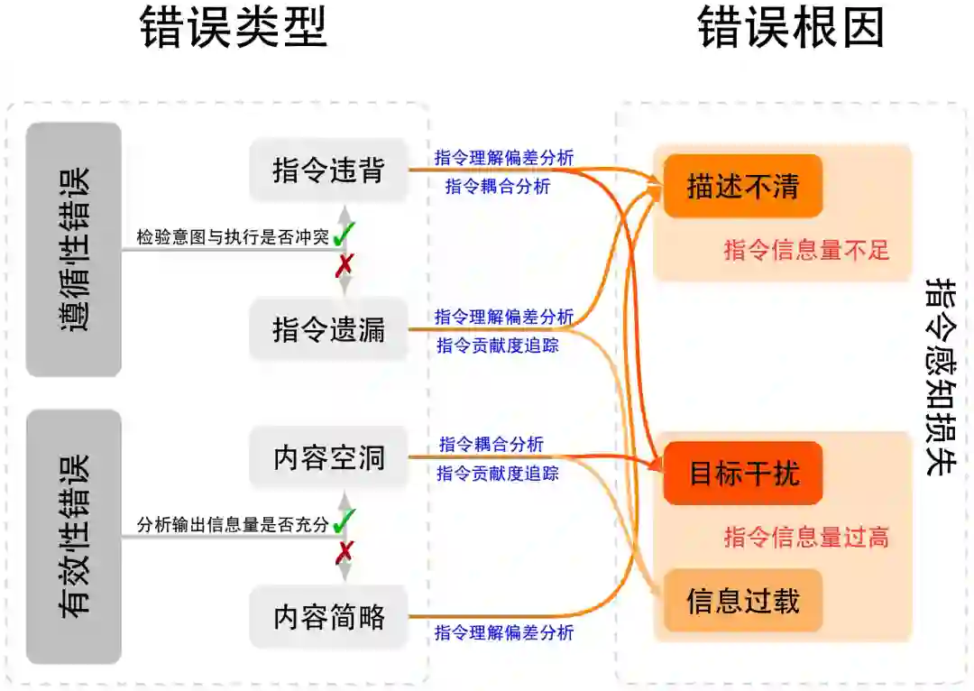 图1:错因分析总览 基于上述背景,我们提出对大模型错因与诊断方法进行体系化的调研与总结,旨在将目前散落于不同任务、不同模型、不同研究范式中的大模型出错诊断技术与错因溯源分析加以结构化、分类化与整合。我们主张构建一个涵盖数据与知识分布、表示机制、推理过程、不确定性、上下文利用、检索增强、指令理解等多个维度的错误诊断与错因分析框架。这样做具有重要意义:首先,它为研究者提供了系统化视角,能将行为级现象与模型底层机制映射起来,从而提升对大模型出错原因的理论理解;其次,它为工程实践提供了可操作的诊断指南,研究者或开发者可据此选择针对性的诊断策略、对模型进行定量评估、并制定修复流程;最后,通过建立共有的分类范式与基准流程,有望促进跨模型、跨任务、跨团队的比较研究与结果复现,进而推动大模型生态向可解释与可信的方向演进。总而言之,我们希望构建体系化的总结而不是简单的整理,将错因诊断从孤立案例提升为共建公共知识库和规范分析决策流程,从而加速大模型从黑箱困境向工程可管信任系统的转型。