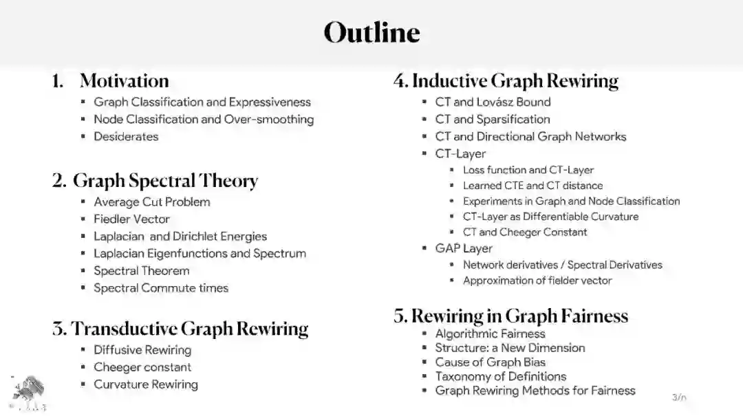 图神经网络(GNN)已被证明在处理与图相关的任务方面取得了有竞争力的结果,如节点和图分类、链接预测以及各种领域中的节点和图聚类。尽管结果很有希望,但据报道GNN存在过度平滑、过度挤压和不足。文献中提出了图重连和图池化作为解决这些限制的解决方案。图重连包括修改(编辑和/或重新加权)图的边,以便针对特定任务(如图/节点分类或链接预测)优化信息流。许多图重连方法依赖于边采样策略:首先,根据相关函数为边分配新的权重,然后根据新的权重对它们进行重新采样,以保留最相关的边(即那些具有较大权重的边)。计算边缘相关性的方式有很多种,包括随机计算、基于相似度计算或基于边缘曲率计算。本教程提供了文献中提出的基于扩散、曲率或谱概念的图重连的最相关技术的概述。它将解释它们的关系,并将介绍最相关的最先进的技术及其在不同领域的应用。本教程将从理论、经验和伦理的角度概述这一领域的开放性问题。