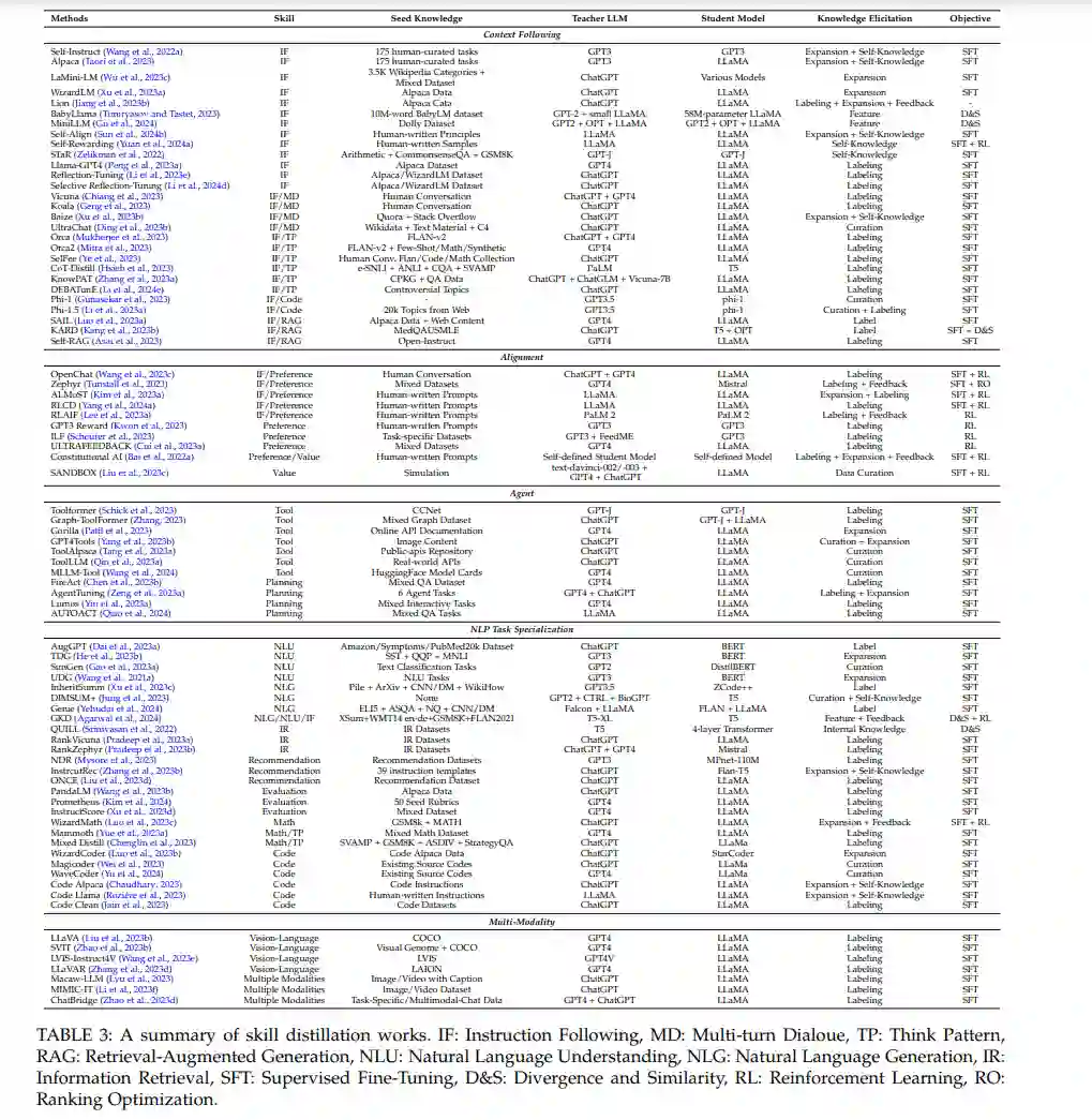 在第3节关于引出知识和蒸馏算法的基础上,我们将关注转向这些技术如何促进LLMs中特定技能的蒸馏。我们的探索将包括LLMs展示的多种技能,包括上下文跟随、对齐、代理、NLP任务专业化和多模态性。上下文跟随侧重于学生模型理解和有效响应输入信息的能力。对齐深入探讨学生模型将其输出与教师响应对齐的能力。接下来,代理强调语言模型的自主性。NLP任务专业化突出了LLM在各种自然语言处理任务中专业化的多样性,展示了其适应性。最后,多模态性包括从教师LLMs到多模态模型的知识转移。