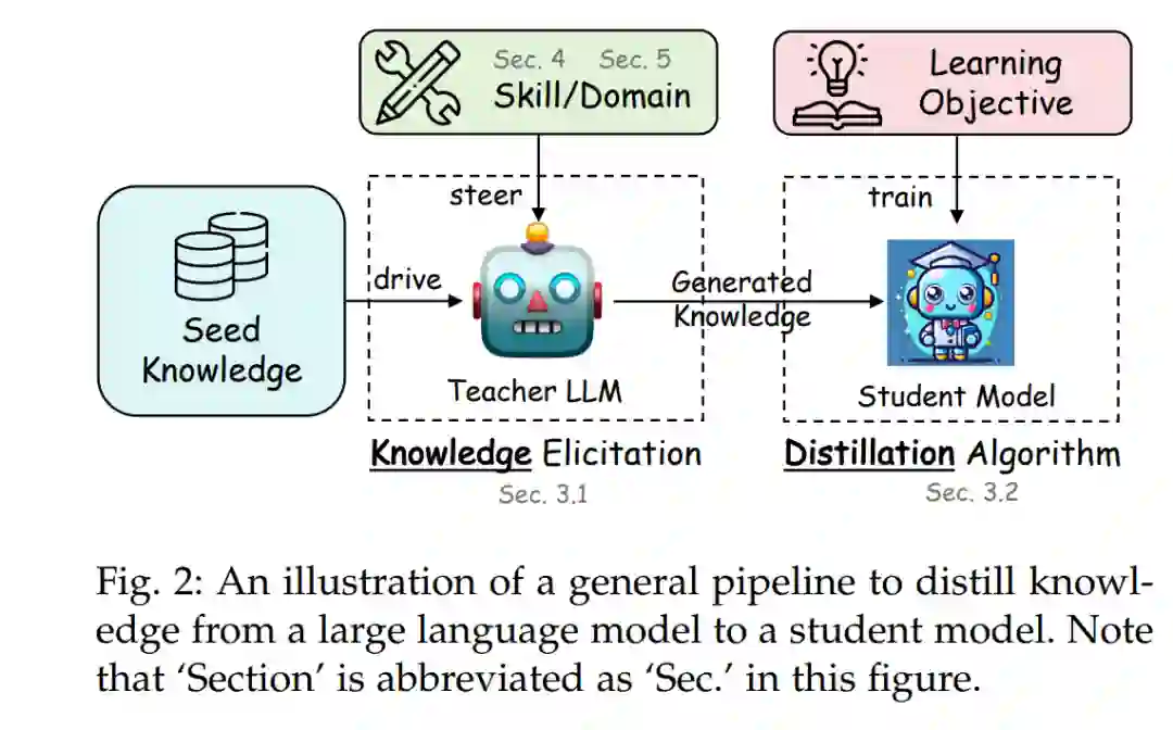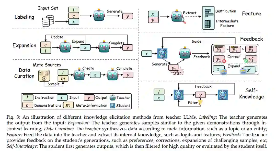 本节通过知识蒸馏的过程进行导航。根据第2.4节,它被分为两个主要步骤:‘知识’,专注于从教师LLMs中引出知识(公式1),以及‘蒸馏’,集中于将这些知识注入学生模型中(公式2)。我们将在后续章节中详细阐述这两个过程。