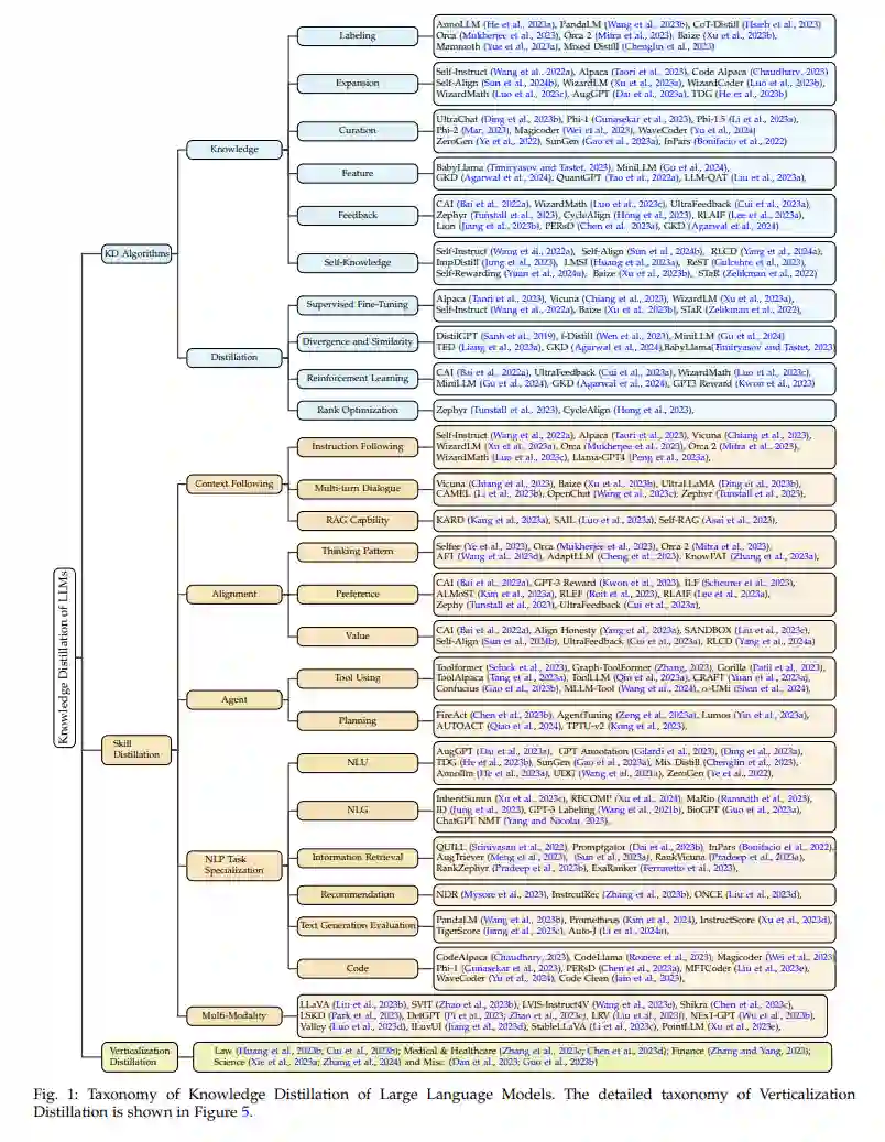 由于AI景观的迅速演变(OpenAI et al., 2023; Team et al., 2023)和这些模型的增加复杂性,对LLMs知识蒸馏进行全面综述的迫切需求不断上升。随着AI继续渗透到各个领域,从专有LLMs高效、有效地蒸馏知识到开源模型的能力不仅是一个技术愿景,而且是一个实际必需。这种需求由对更可访问、成本效益和可适应AI解决方案的日益增长的需求所驱动,这些解决方案可以满足广泛的应用和用户群体。在这一领域进行综述对于综合当前的方法论、挑战和知识蒸馏的突破至关重要。它可能作为研究人员和实践者的灯塔,引导他们通过将复杂的AI能力蒸馏成更易管理和更易访问形式的错综复杂的过程。此外,这样的综述可以照亮前进的道路,识别当前技术中的差距,并提出未来研究的方向。综述组织。这项综述的其余部分被组织成几个全面的部分,每个部分旨在深入探讨LLMs领域内知识蒸馏的多方面。继本介绍之后,§2提供了知识蒸馏的基础概述,比较了传统技术与LLMs时代出现的技术,并强调了数据增强(DA)在此背景下的作用。§3深入探讨了从教师LLMs中引出知识的方法和核心蒸馏算法,检查了从监督微调到涉及差异和相似性、强化学习和排名优化的更复杂策略的方法。然后,§4专注于技能蒸馏,探索如何增强学生模型以改善上下文理解、与用户意图的对齐以及在各种NLP任务中的表现。这包括对自然语言理解(NLU)、生成(NLG)、信息检索、推荐系统和文本生成评估的讨论。在§5中,我们涉足特定领域的垂直蒸馏,展示了知识蒸馏技术如何在法律、医疗保健、金融和科学等专业领域内应用,说明了这些方法的实际含义和变革性影响。综述在§6中提出了开放问题,识别了知识蒸馏研究中当前的挑战和差距,为未来的工作提供了机会。最后,§7中的结论和讨论综合了获得的洞察,反思了对更广泛的AI和NLP研究社区的影响,并提出了未来研究的方向。