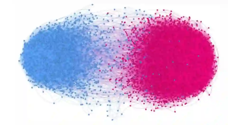 图 1:推特上两极分化、相互隔离的网络。社会影响力和取消关注加速了回声室的出现。